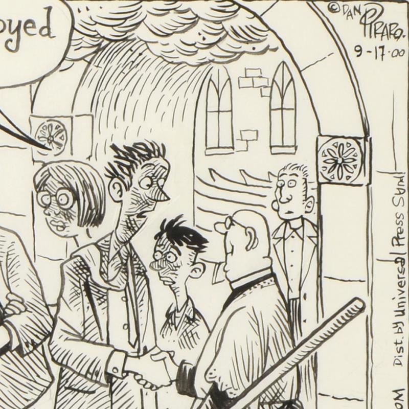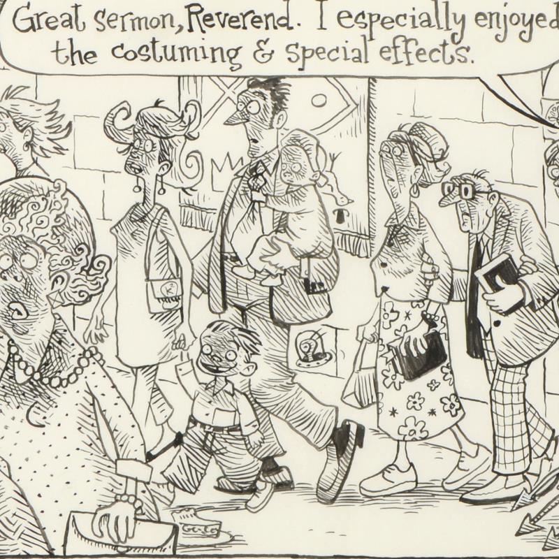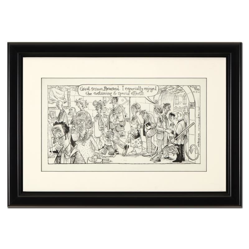 Enter a surreal and satirical world of twisted imagination and award winning creativity. "Holy Special Effects" is an original pen & ink drawing on paper by Dan Piraro, creator of the critically acclaimed and award winning comic strip, Bizarro. This piece is hand signed and comes framed. Includes Letter of Authenticity! Measures approx. 20.5" x 14.5" (frame), 13" x 7" (image).