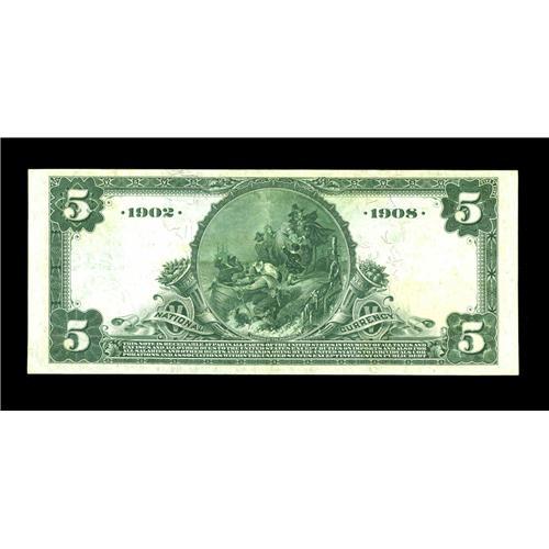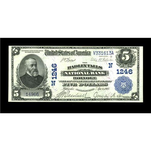 <B>Holyoke, MA</B></I> - $5 1902 Date Back Fr. 590 <B>The Hadley Falls NB</B></I> Ch. # (N)1246<BR>Despite a fairly long issue, notes from this bank are quite scarce, with just twelve examples listed in the Kelly census. This piece, which is new to that listing, is considerably nicer than any of the previously reported specimens. <B>About Uncirculated,</B></I> with great color and loads of original embossing.