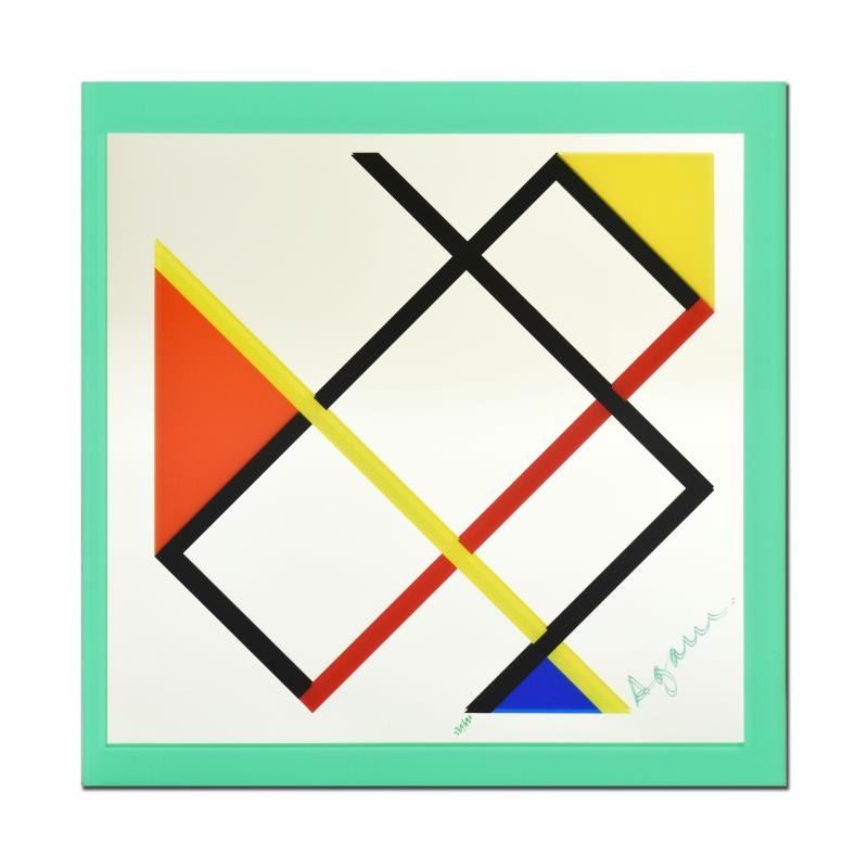 "Homage to Mondrian (Green Border)" is a limited edition color serigraph with pigments baked onto a quarter inch glass mirror by Yaacov Agam. This piece is numbered and hand signed by the artist. Includes Letter of Authenticity. Measures approx. 28" x 28" (mirror). The ink (particularly the signature) is delicate; no solvents, not even Windex should be used to clean these areas.