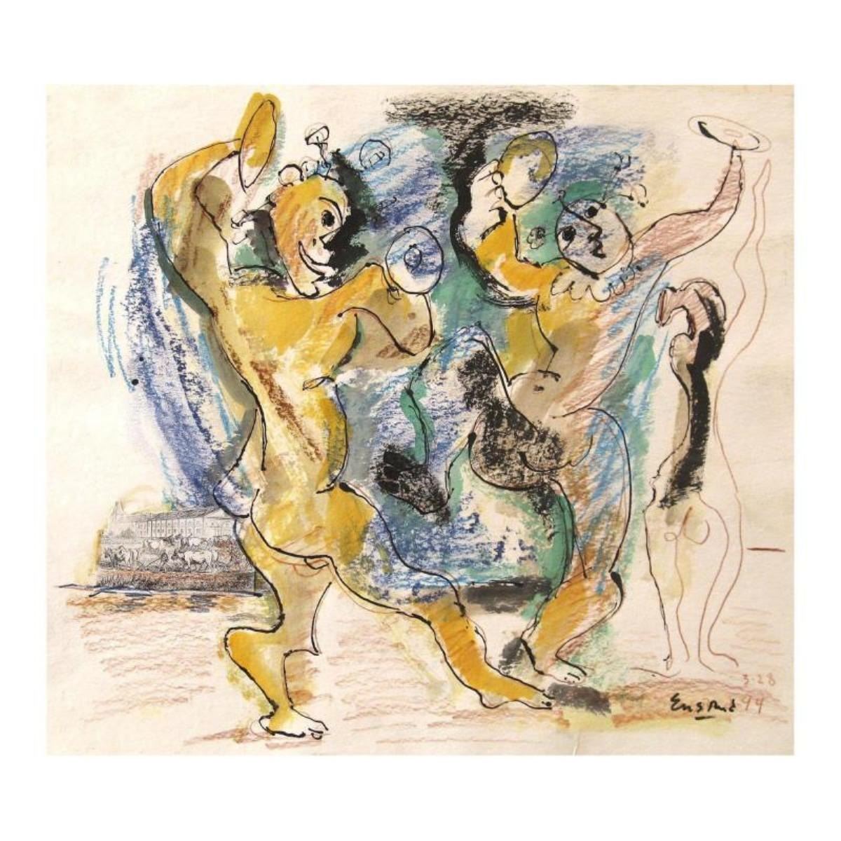 "Homage to the Picasso Mouton-Rothschild Label" is an original Mixed Media on Paper by Wayne Ensrud. The piece is hand signed by the artist and comes with a Certificate of Authenticity. Measures approximately 18" x 20".