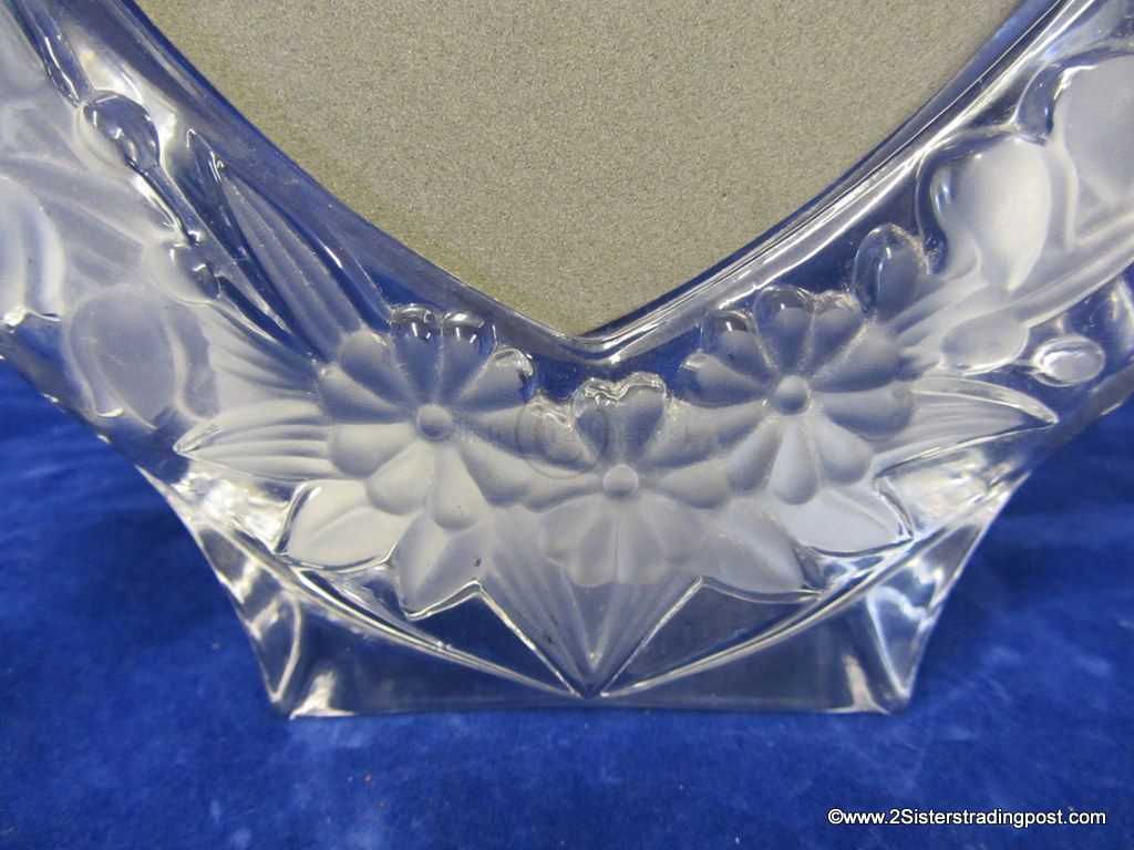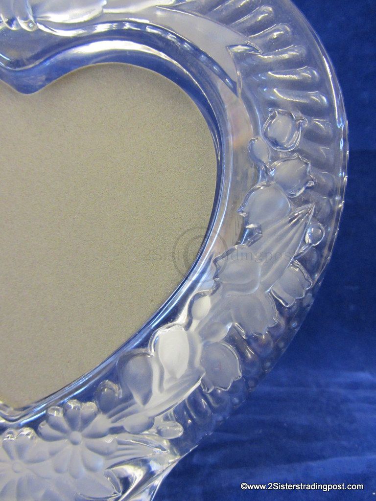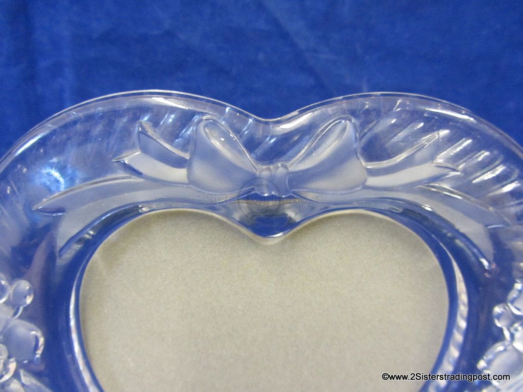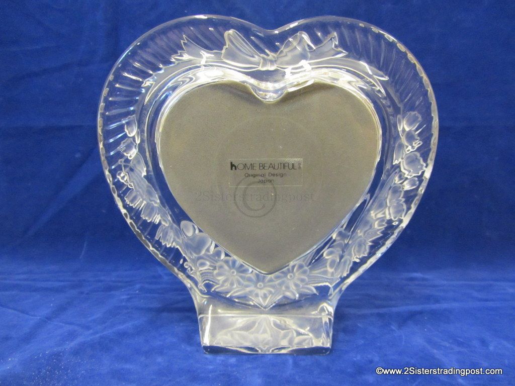 Home Beautiful heart shaped glass photo frame made in Japan. The frame measures 8-7/5" wide x 7-3/8" tall. The frame has a bow at the top center of the heart, with daffodils center bottom and lily of the valley going up both sides. Flowers and bow are raised and frosted. This is a solid glass piece and weighs almost 3 pounds.