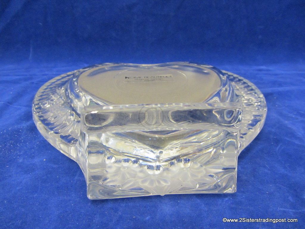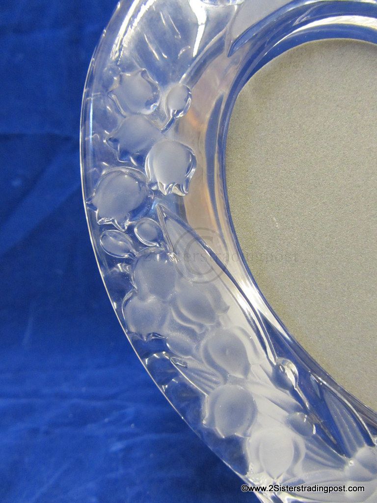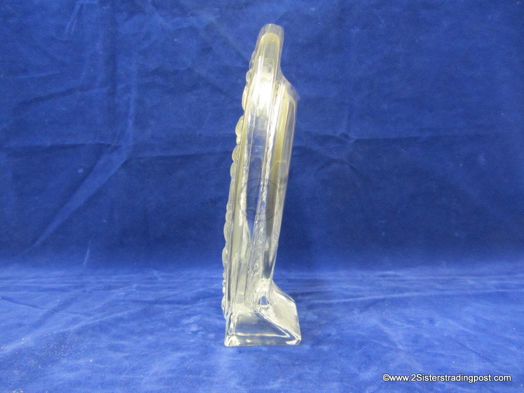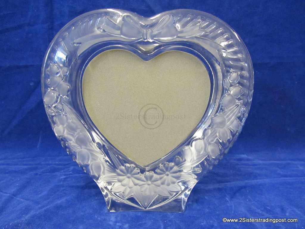 Home Beautiful heart shaped glass photo frame made in Japan. The frame measures 8-7/5" wide x 7-3/8" tall. The frame has a bow at the top center of the heart, with daffodils center bottom and lily of the valley going up both sides. Flowers and bow are raised and frosted. This is a solid glass piece and weighs almost 3 pounds.