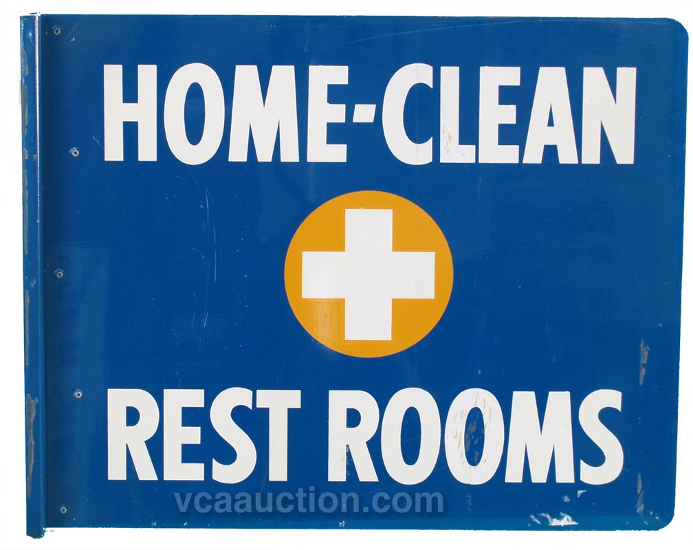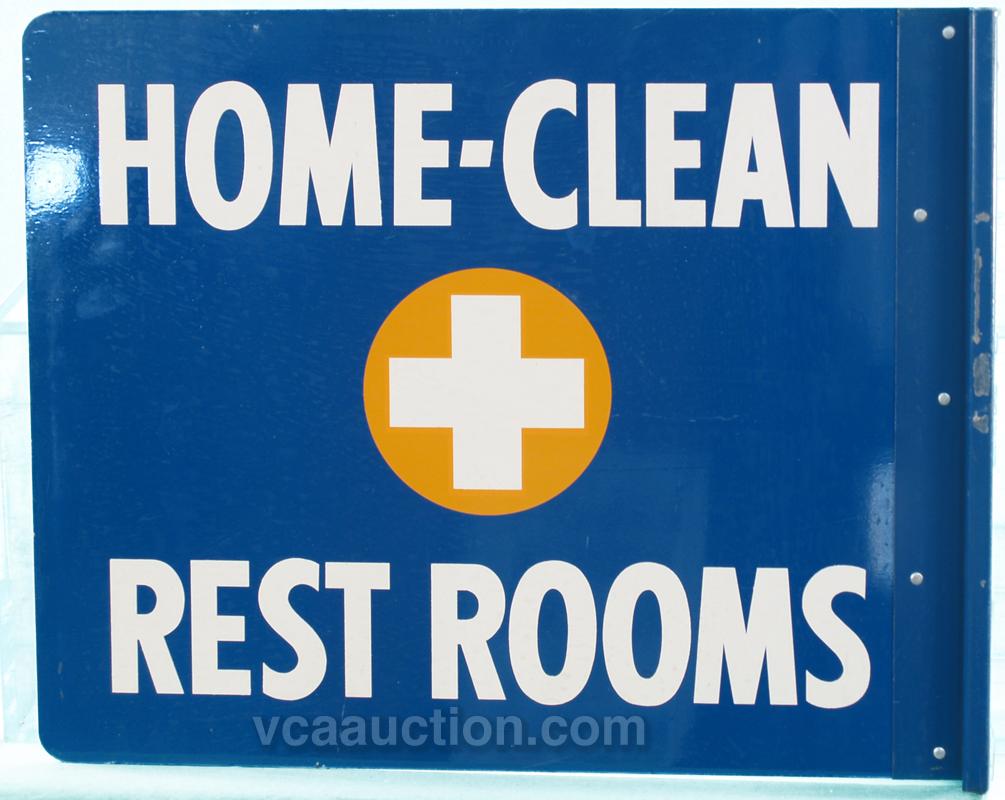 Home - Clean Restrooms Double Sided Service Station Flange Metal Sign, Very Good Condition - 17" x 14"