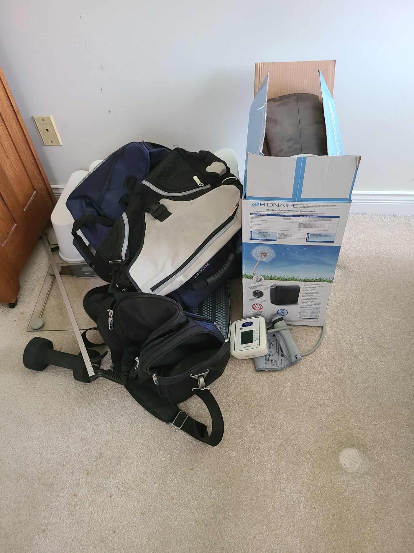 Lot includes scales, blood pressure cuff, Bionaire allergen remover, squatting potties, and more. Bring packing supplies. Pickup at 9 am.