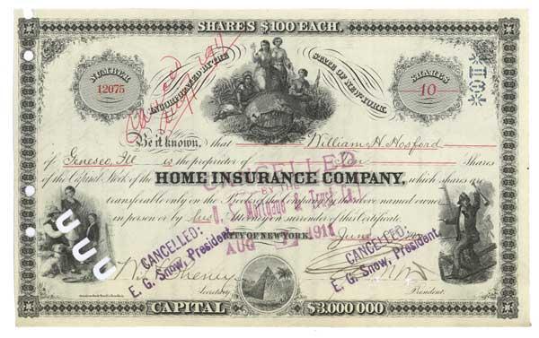 1911, New York. Stock certificate for 10 shares. Black/White. Multi vignetted certificate. Pen, stamp and punch cancelled. Very fine.
