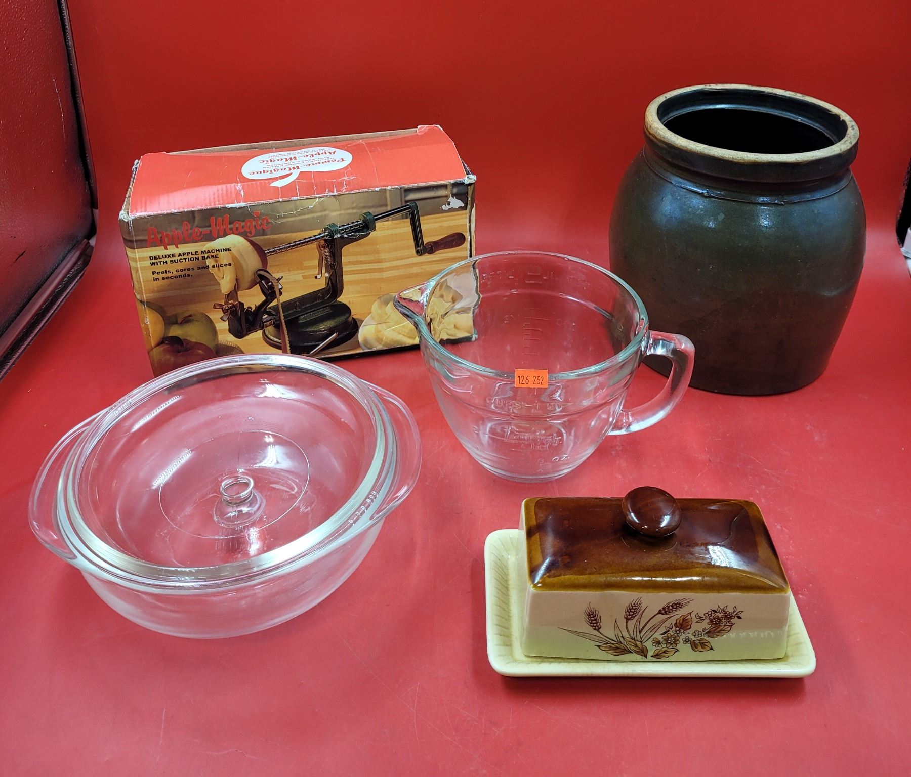 Home & Kitchen Lot w/ Stoneware Butter Dish, Apple Machine, Pampered Chef Measuring Cup, & More