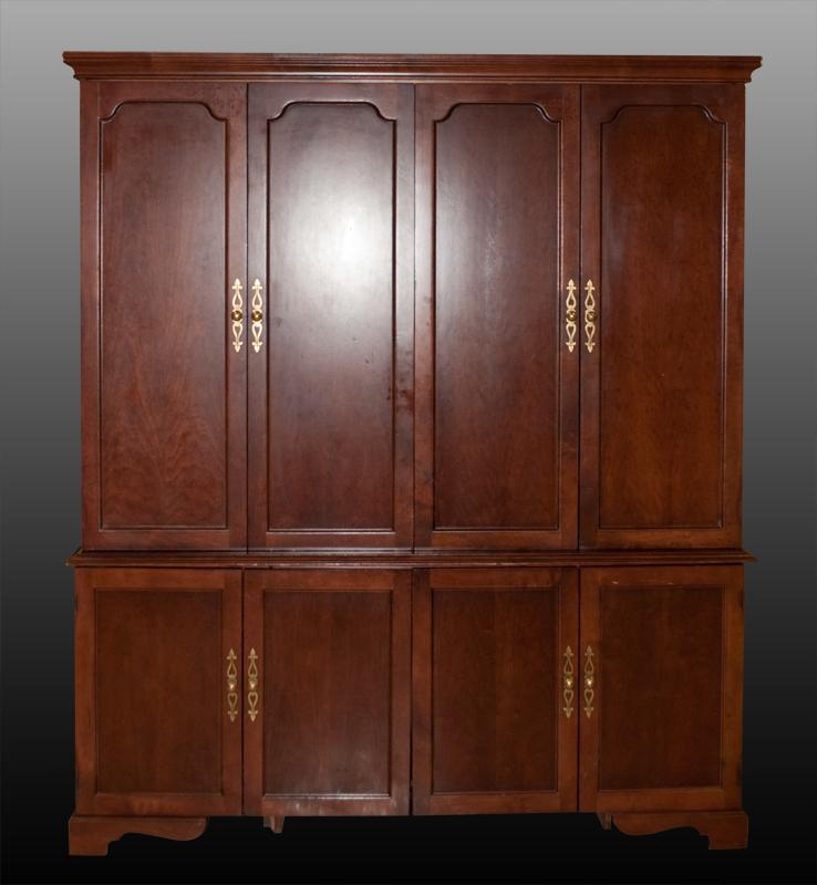 By Sligh Home Furniture in Holland, Michigan, the Homeworks Collection. Large computer desk with single drawer on left, three drawers on right, pull out keyboard drawer. Credenza with above shelving and two lights. Both top and bottom piece with concealer doors. 80" H x 69" W x 24.5" D. Wear throughout as well as nicks and abrasions consistent with age and use.