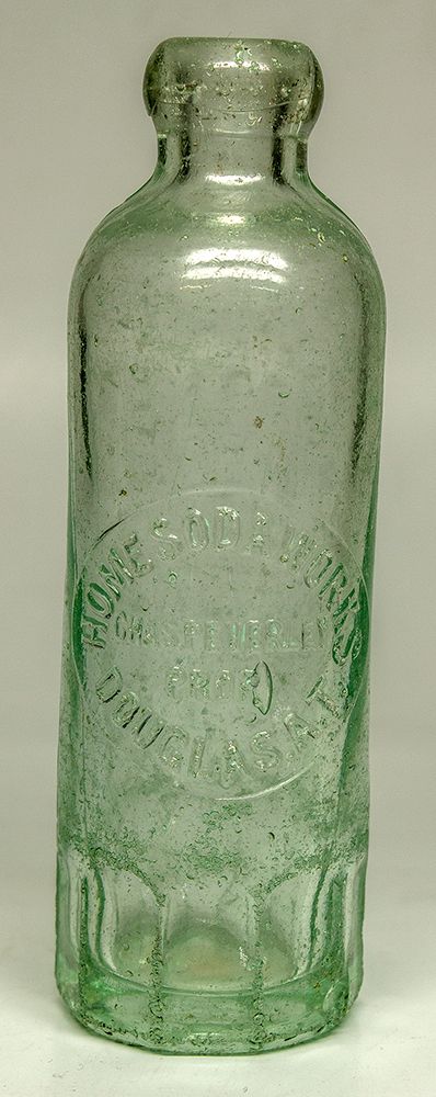 1903 This is a tooled top Hutchinson aqua bottle from the Home Soda Works of Douglas, Arizona. According to Michael R. Miller’s A Collector’s Guide to Arizona Bottles & Stoneware, second edition, owner Charles Peverley got into the saloon and soda business in 1903. This bottle is rough around the lip and has a chip near the base. Bud Bassett Collection - HKA#65345
