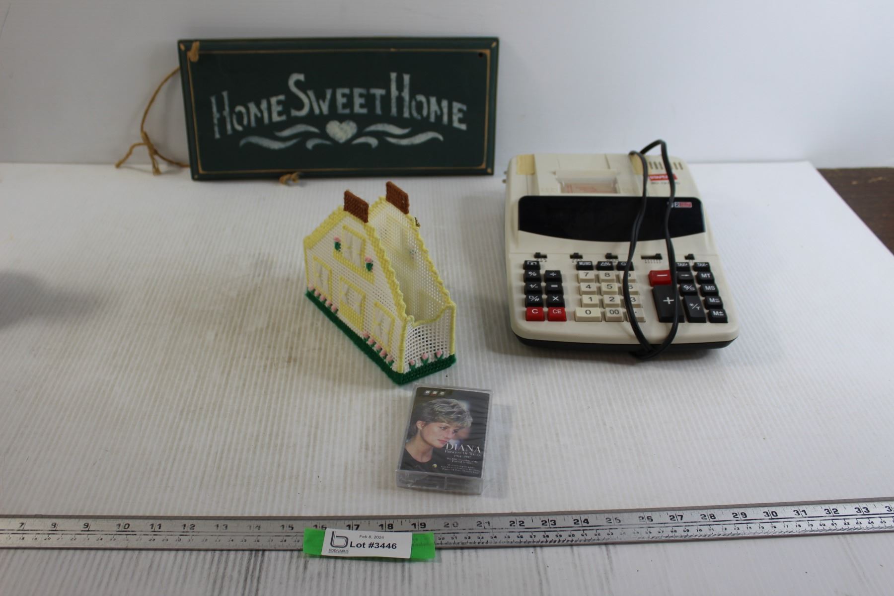 Home Sweet Home Sign - 16" x 7", Napkin Holder, Princess Diana Tape, Adding Machine - Untested