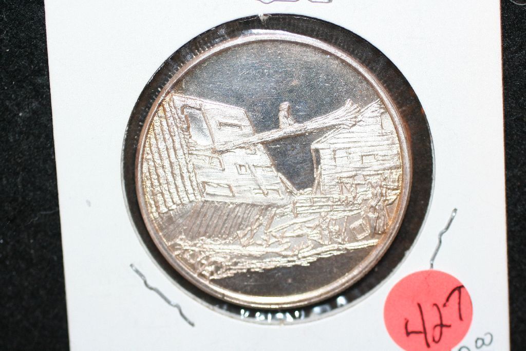 Home of John Schultz Silver Round; Flood of 1889 Home Turned Over When Hit By Tree Leaving Roots 30 Feet High; .999 Fine Silver 1 Oz.