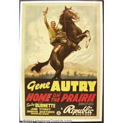 Home on the Prairie (Republic, 1939). One Sheet (27"X41") This one sheet is considered one of Gene Autry's best as it features the singing cowboy in a classic pose a top his trusted horse, Champion! Very Fine+ on Linen.Important notice: We expect to be auctioning lots at the rate of 200-250 per hour. Sometimes eBay Premier live bid software cannot keep up with that pace, so we strongly recommend that you place a realistic proxy bid now as insurance to avoid disappointment. Also please note that all Heritage/CAA lots purchased through eBay Premier carry a 20% Buyer's Premium.