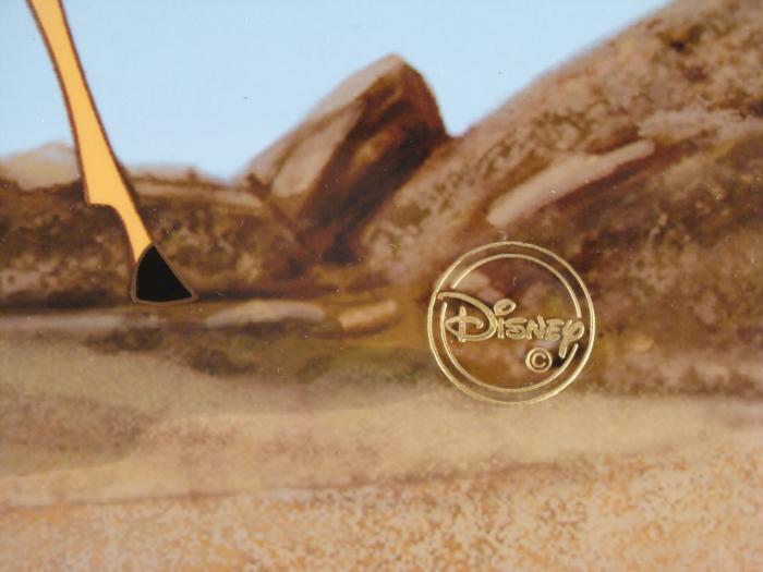 "Using traditional animation techniques, artist of The Walt Disney Studios Ink and Paint Department have re-created these character images for The Animated Animations Company. Reproduced animation drawings from the original film are transferred to each acetate cel by a special 6-step xerographic process using one ink color. Each cel is ten enhanced with 17 hand-inked line colors and then hand-painted with 28 Disney-approved acrylic colors and 2 special effect colors.