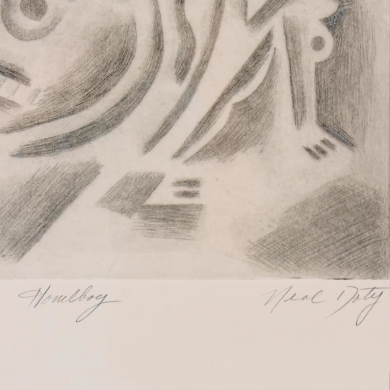 "Homeboy" is a limited edition mixed media on paper by Neal Doty (1941-2016), AP numbered 13/14 and hand signed by the artist. This piece comes custom framed. Includes Letter of Authenticity. Measures approx. 24" x 29" (frame), 12" x 16" (image).