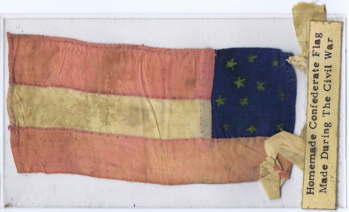 Petit 11-star Stars and Bars flag, hand-stitched, made during the Civil War. 2 x 4 1/4, comprising two red (now pink), one white, and one midnight blue piece of silk, primitively but neatly sewn together with dark pink thread, the stars hand-painted in muted gold. Two white silk ties, to affix to a small stick (not present); when viewed from obverse, the field of stars is on the right. Mottled with soiling (or perspiration) in left half, red (a fugitive dye) faded to pink, else good, with enormous appeal and character. Details of its condition suggest that it was carried - multiple times - by a patriotic Southerner, perhaps in a pocket, or secured to a hat band. Acquired by consignor in mid-1960s. Rare, likely more so than a full-size Confederate flag (which would fetch five figures).