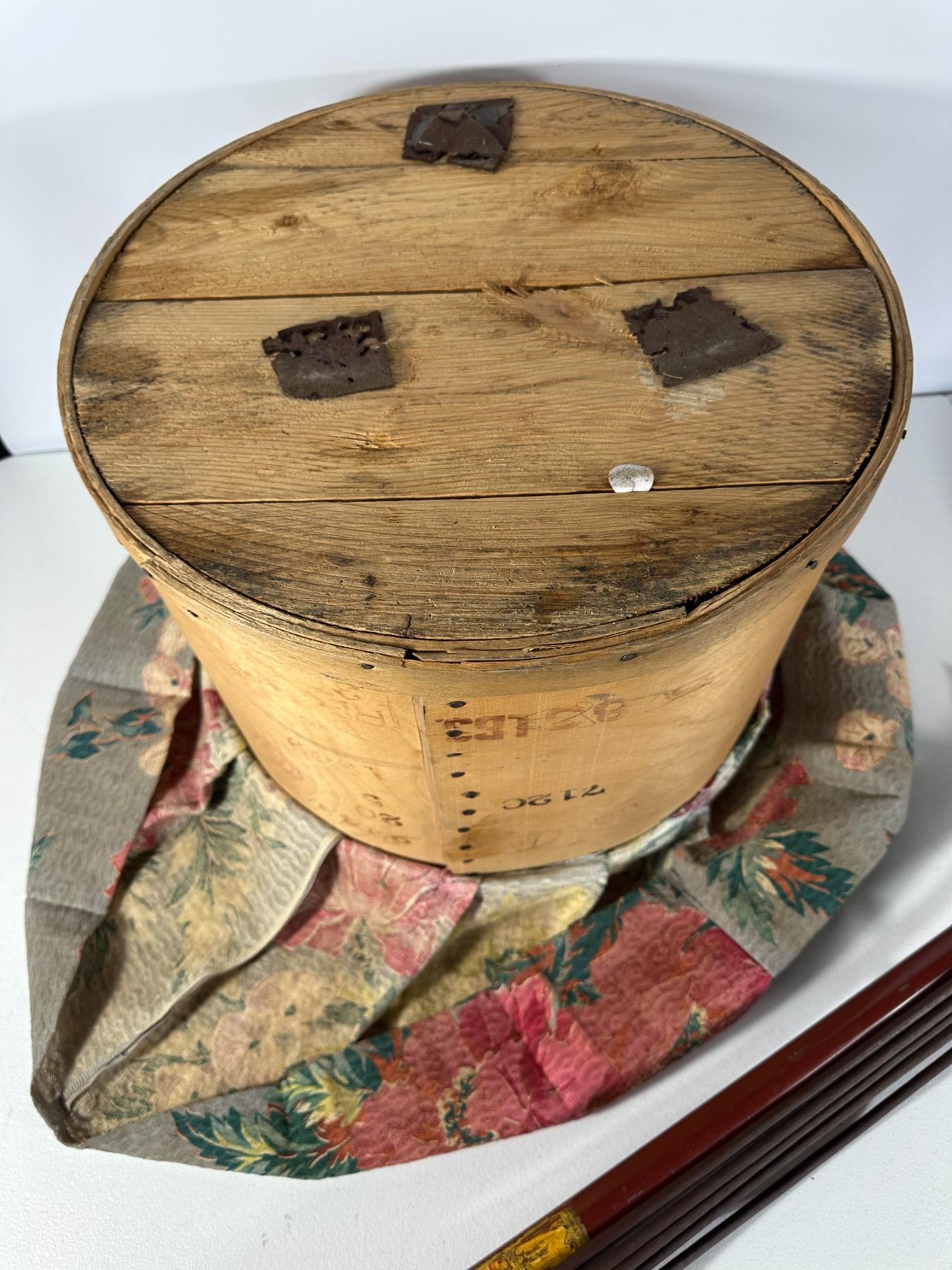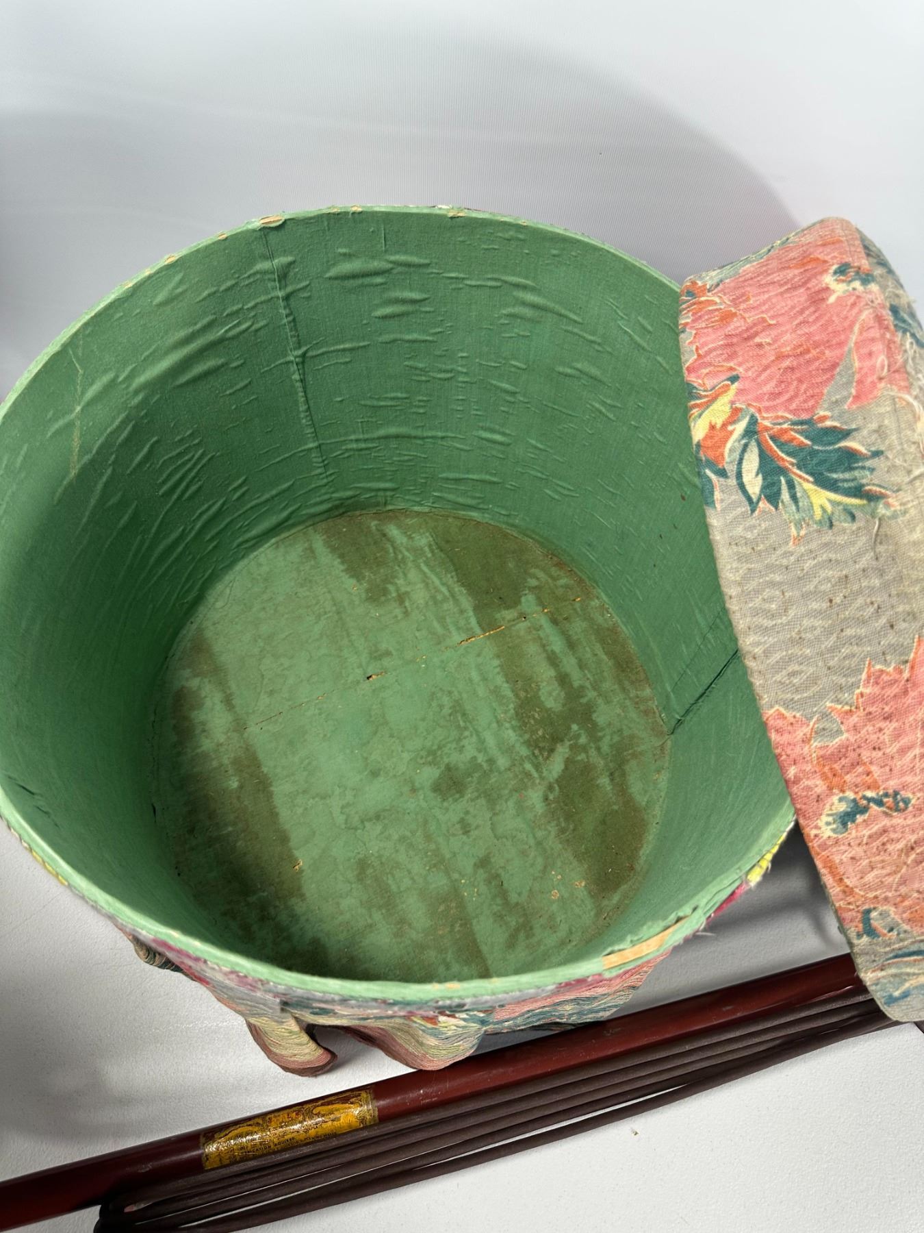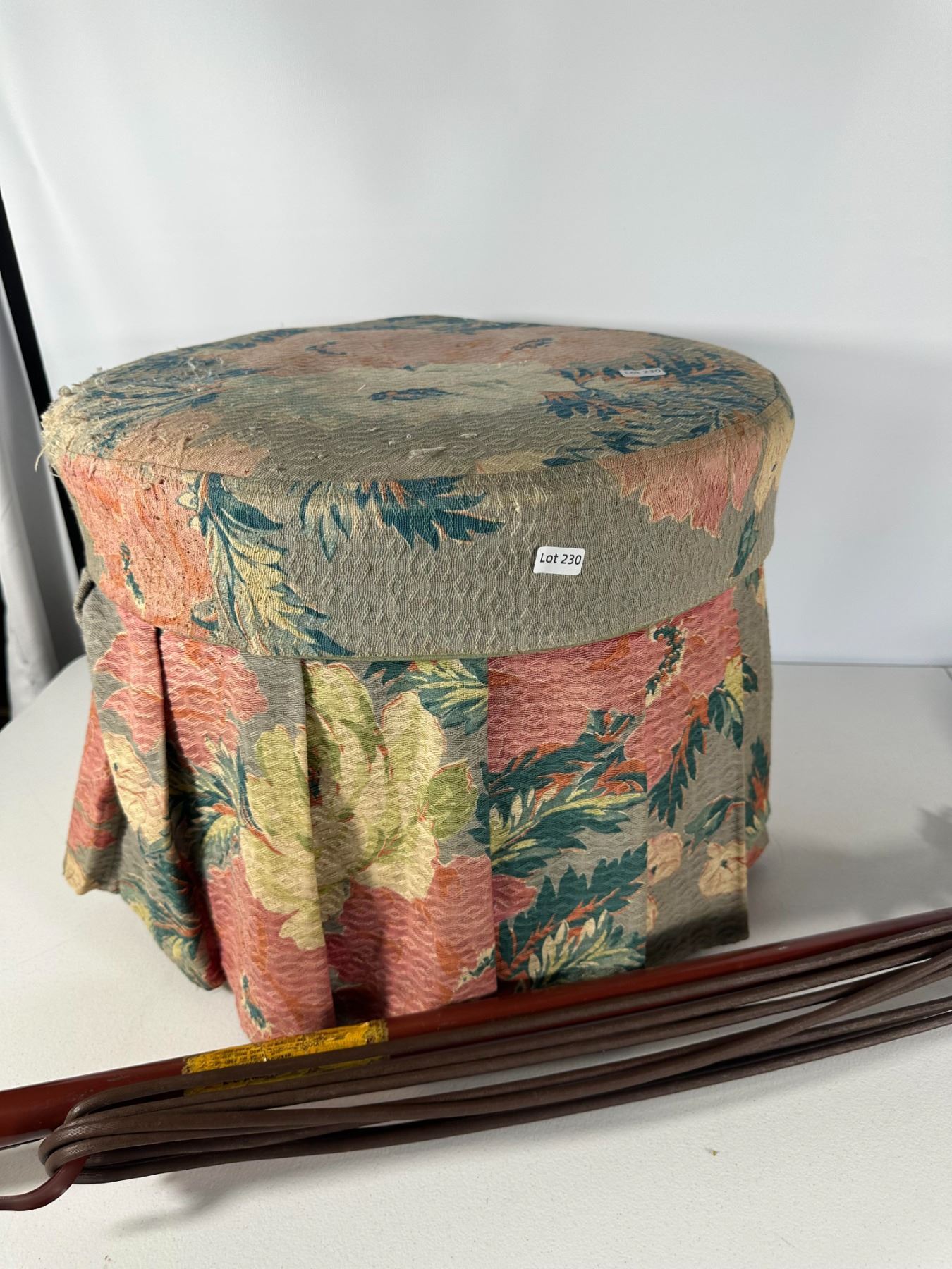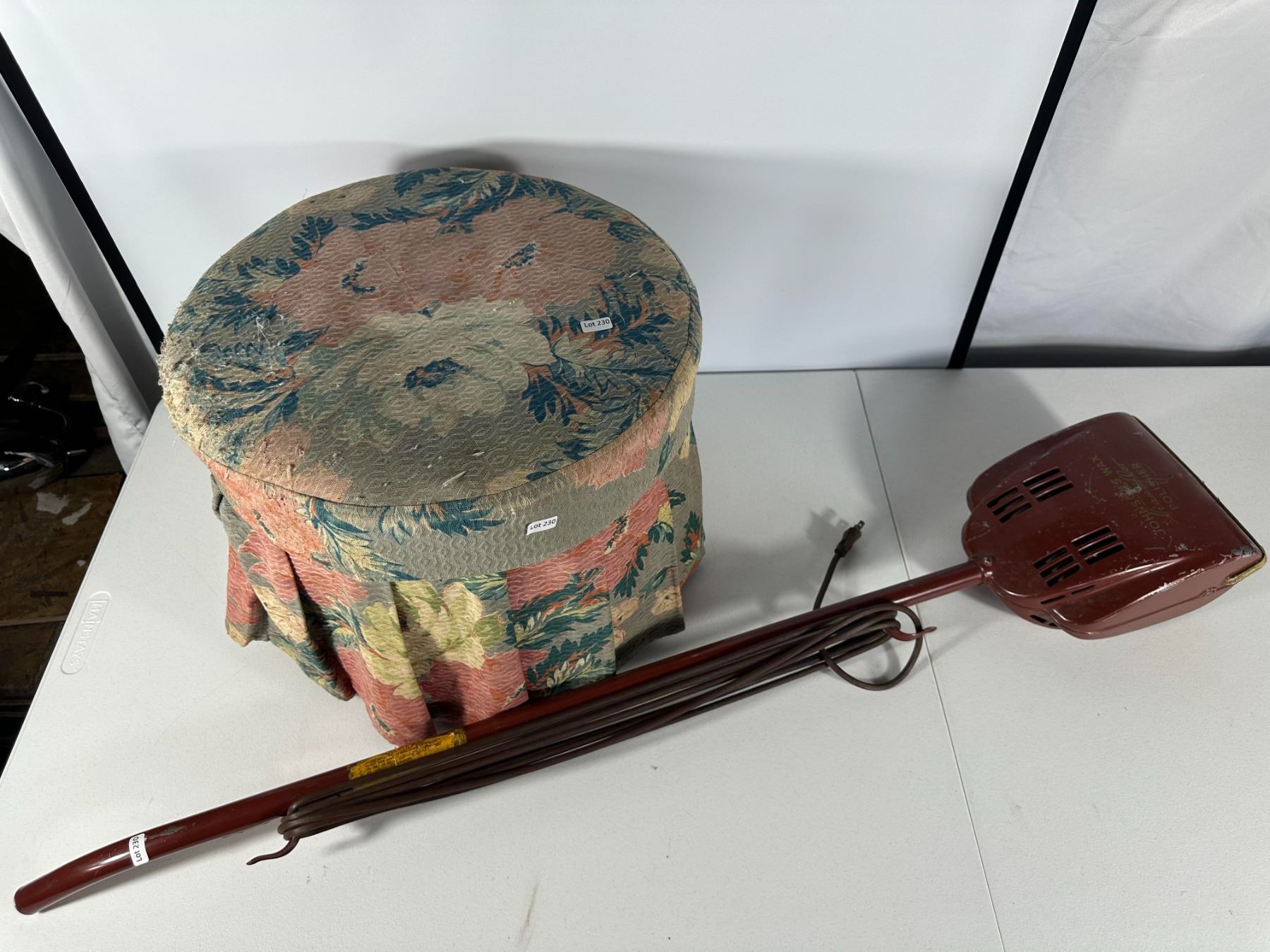 Round fabric‑skirted footstool with lift‑top storage made from an old wooden cheese box, together with a metal upright electric floor polisher (untested).