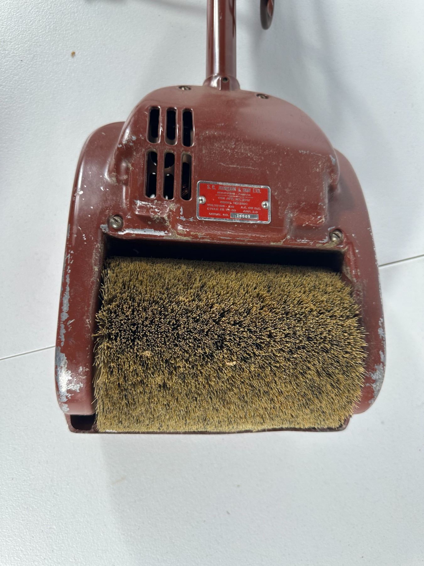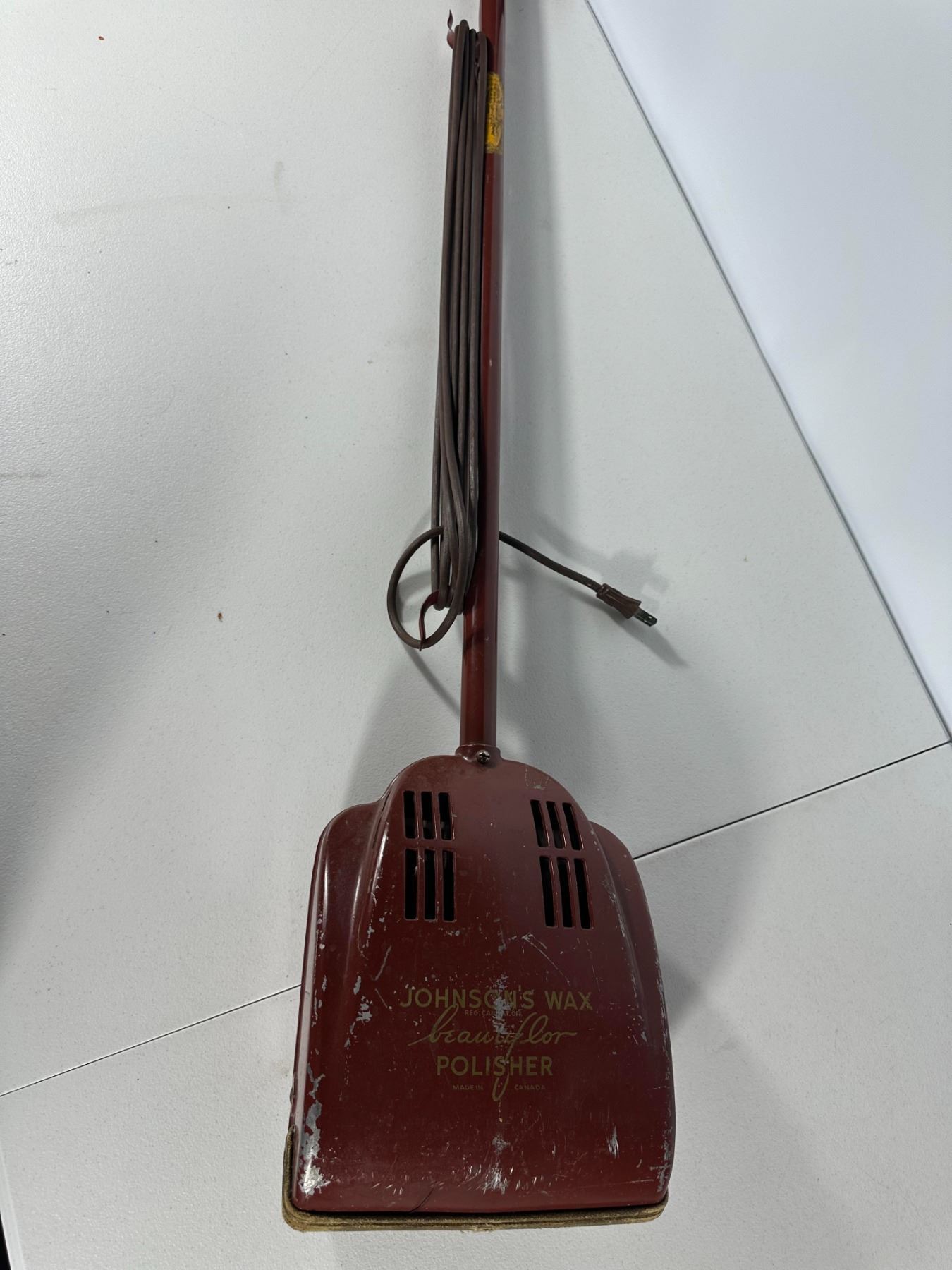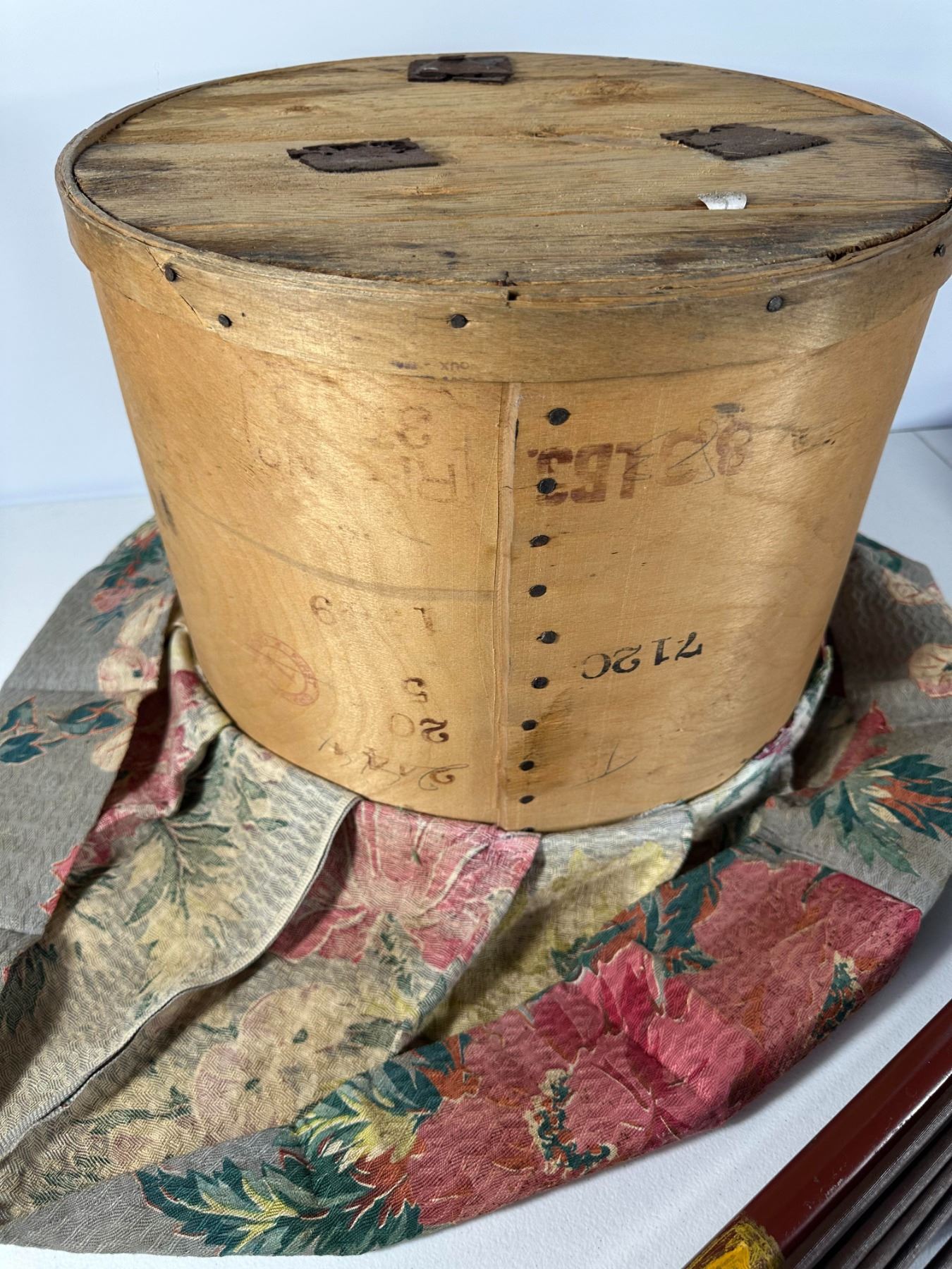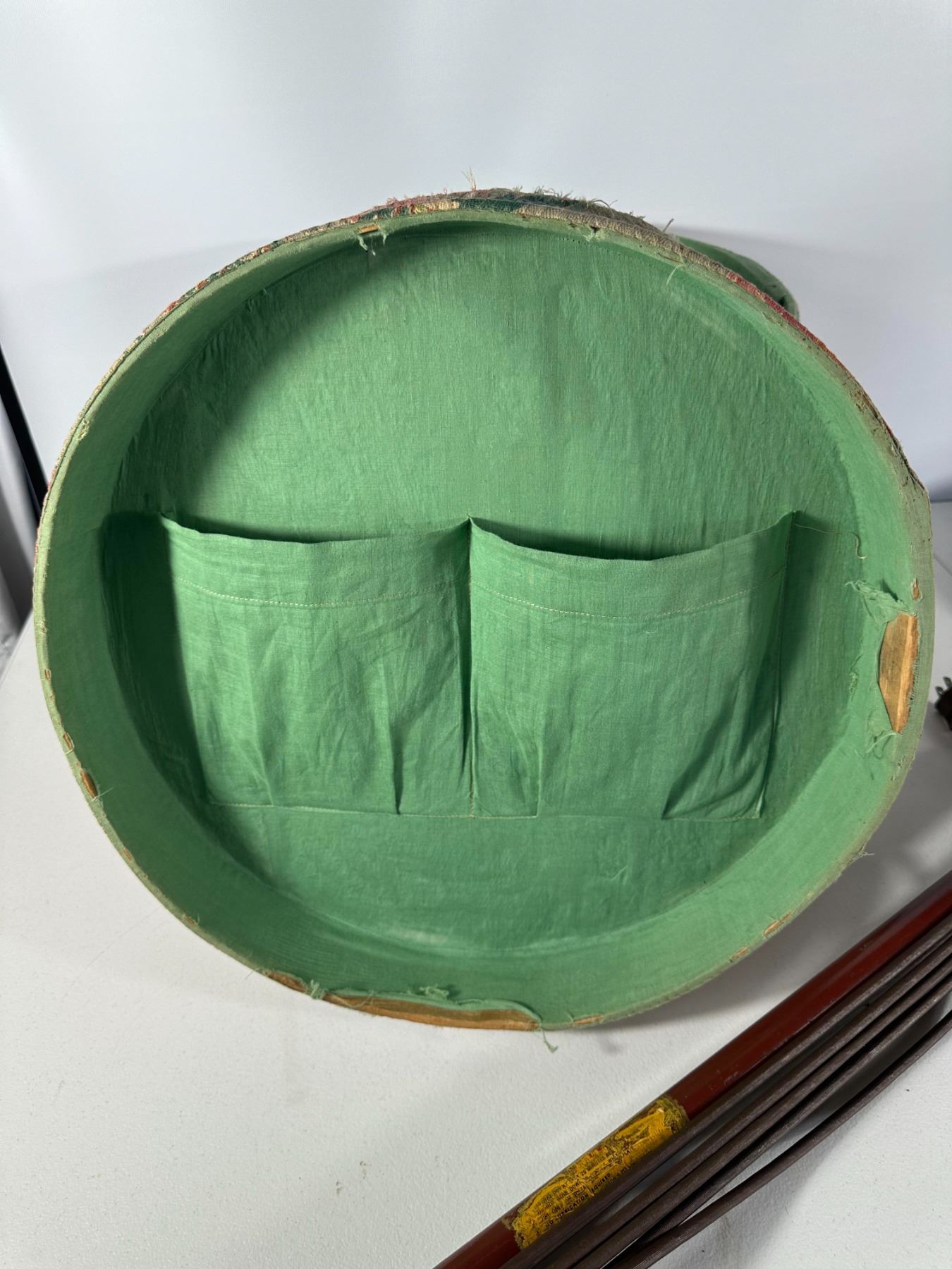 Round fabric‑skirted footstool with lift‑top storage made from an old wooden cheese box, together with a metal upright electric floor polisher (untested).