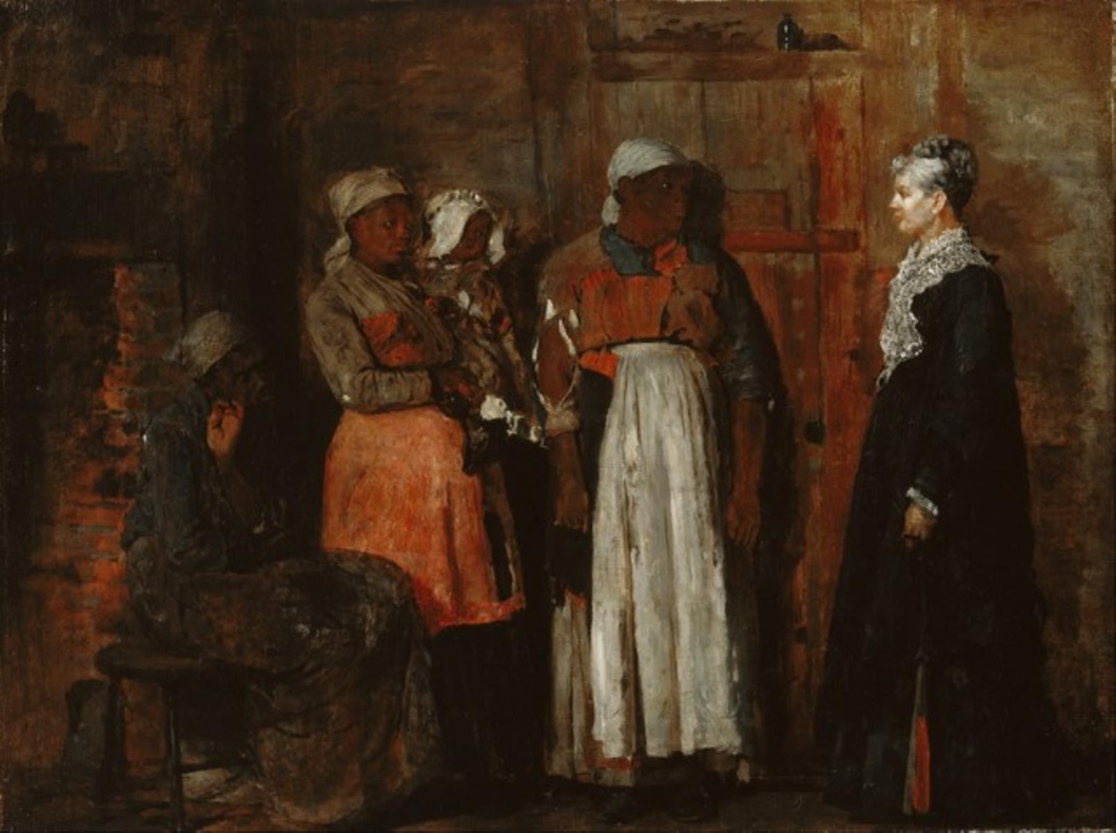 Artist: Winslow Homer - Title: A Visit from the Old Mistress - Medium: Fine Art Giclee on Canvas - Image Size: Approximately 15 inches x 20 inches - Framed: Unframed on Unstretched Canvas - Biography: Winslow Homer was born on February 24, 1836, in Boston, Massachusetts. When Homer was six, the family moved to Cambridge, Massachusetts. His mother was a painter and she encouraged Winslow to be artistic. When he was 19 years old, Winslow became an apprentice at John Bufford's lithographic firm. He started by copying other artists' designs. Later, he submitted his own original drawings to magazines, such as Ballou's Pictorial and Harper's Weekly to be published. In 1859, Homer moved to New York City and worked as a freelance illustrator. The next year, several of his paintings were displayed at the National Academy of Design.