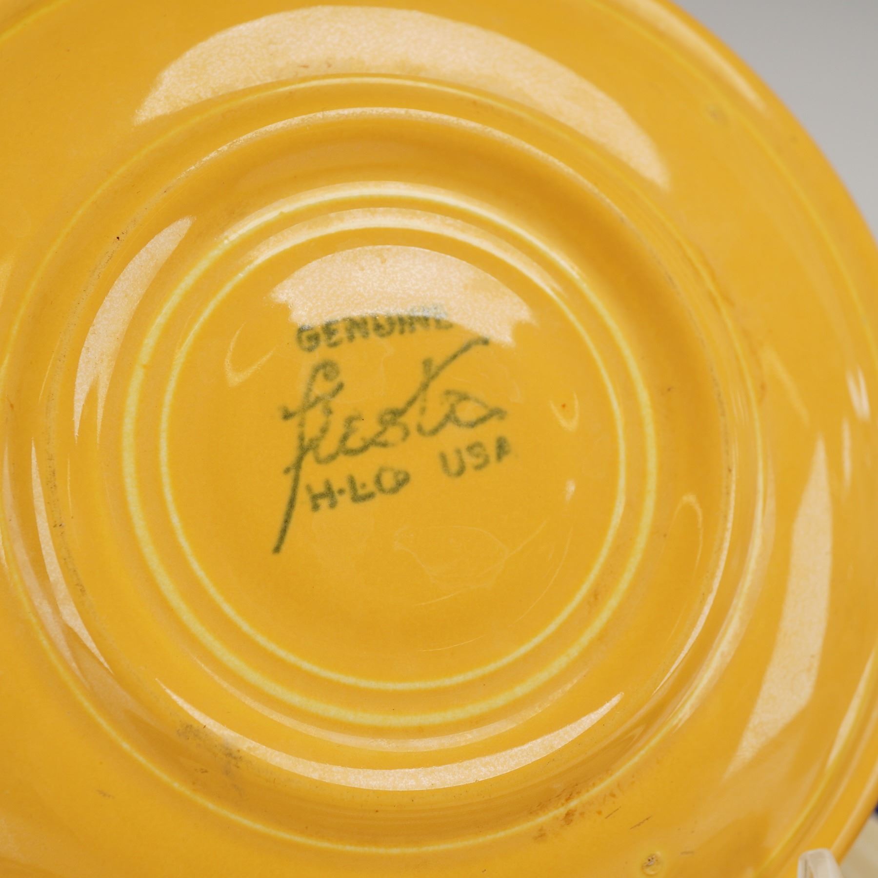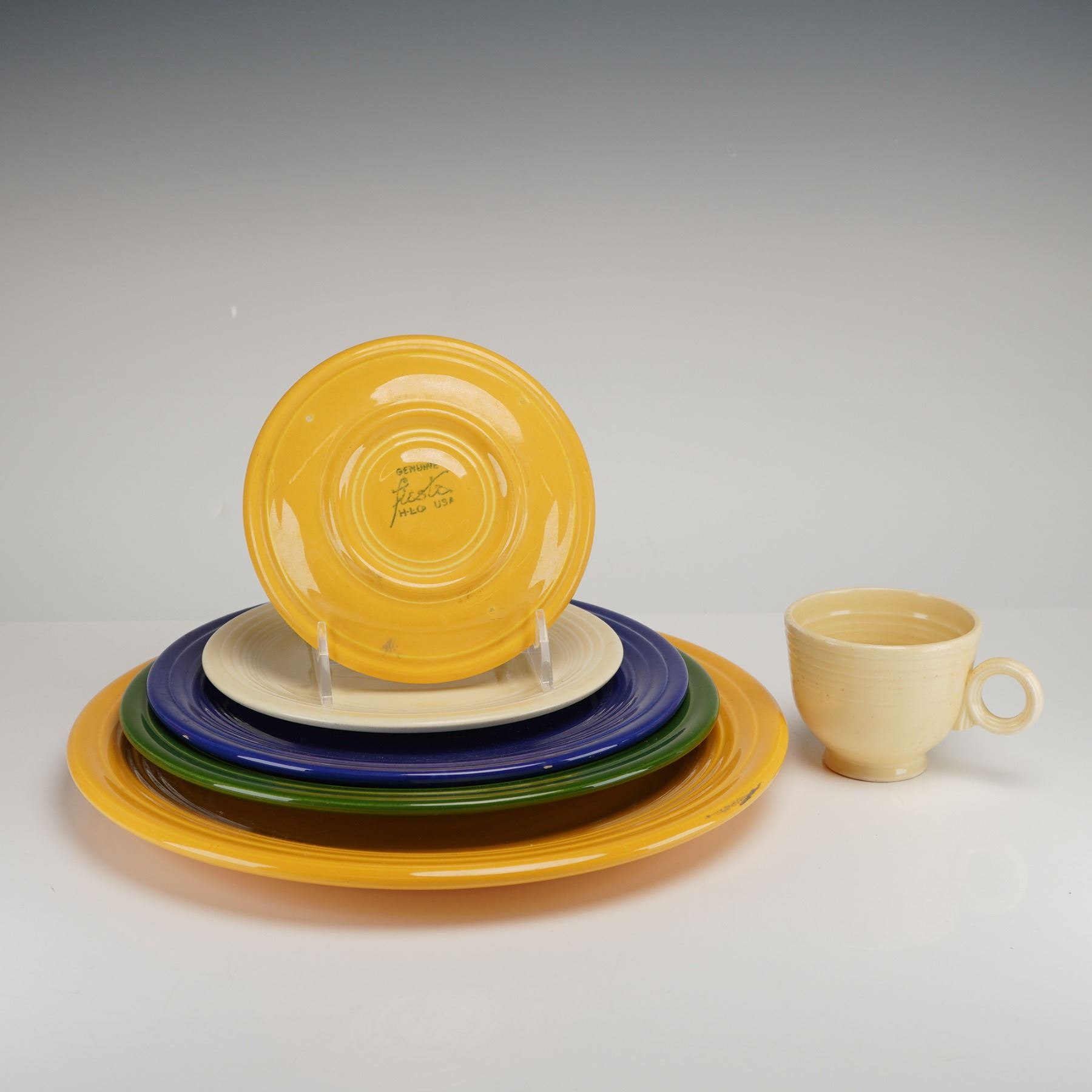 This 6pc homer laughlin company co. fiesta dinnerware grouping features the iconic Art Deco concentric ring pattern in a variety of vintage glazes. Produced by the Homer Laughlin Company, this vintage set includes a large yellow chop plate, a medium green dinner plate, a cobalt blue luncheon plate, and an ivory salad plate. Completing the collection is a yellow saucer with a matching ivory cup featuring the characteristic ring handle. The yellow saucer features the green underglaze backstamp reading GENUINE Fiesta H-L CO USA. Measurement is for largest item.
