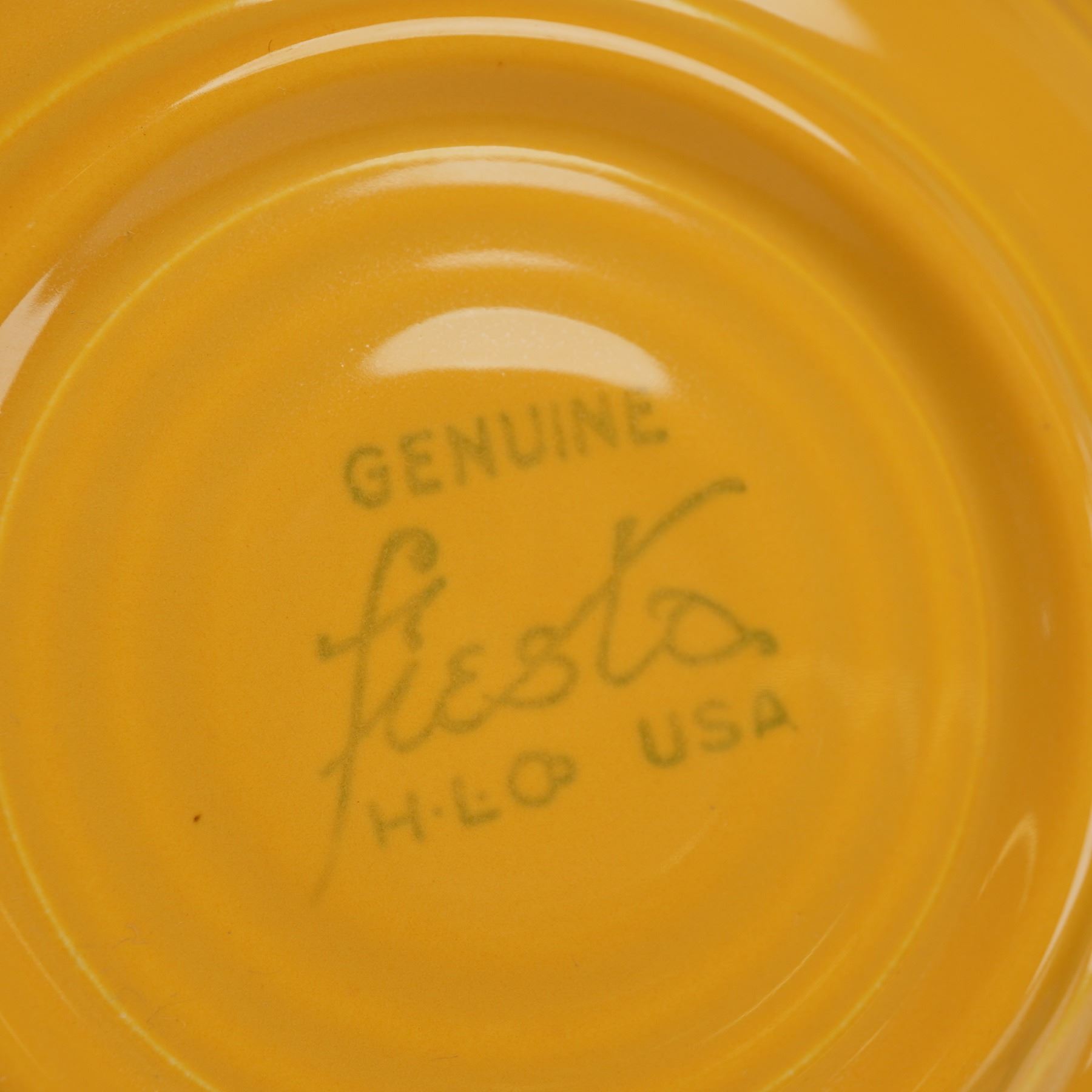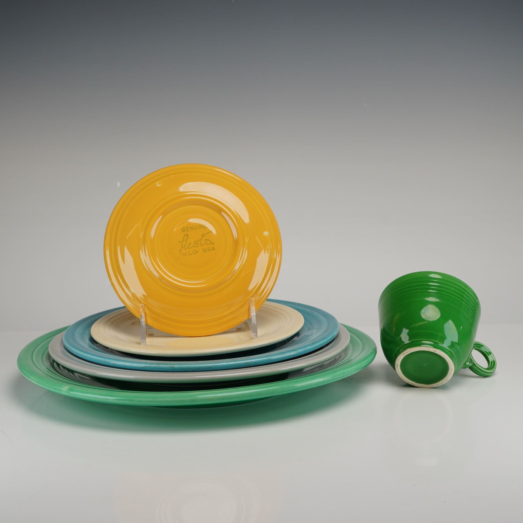 This six-piece collection of vintage Fiestaware ceramic dinnerware was manufactured by the Homer Laughlin Company (HLC). The lot features the iconic Art Deco-inspired Fiesta pattern, characterized by its minimalist aesthetic and signature concentric rings. The assortment includes a variety of colors, featuring a large chop plate in Medium Green, a dinner plate in Grey, a luncheon plate in Turquoise, a salad plate in Ivory, and a cup and saucer in Medium Green and Yellow. The yellow saucer displays the authentic GENUINE fiesta H-L-C USA backstamp. This set offers a vibrant mix of classic American art pottery. Measurement is for largest item. Diameter: 12.25 inches.