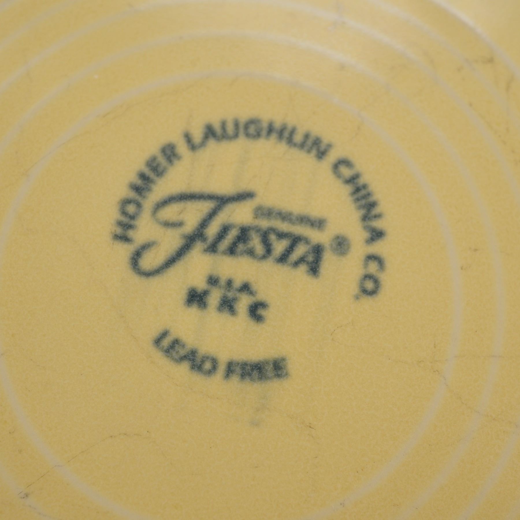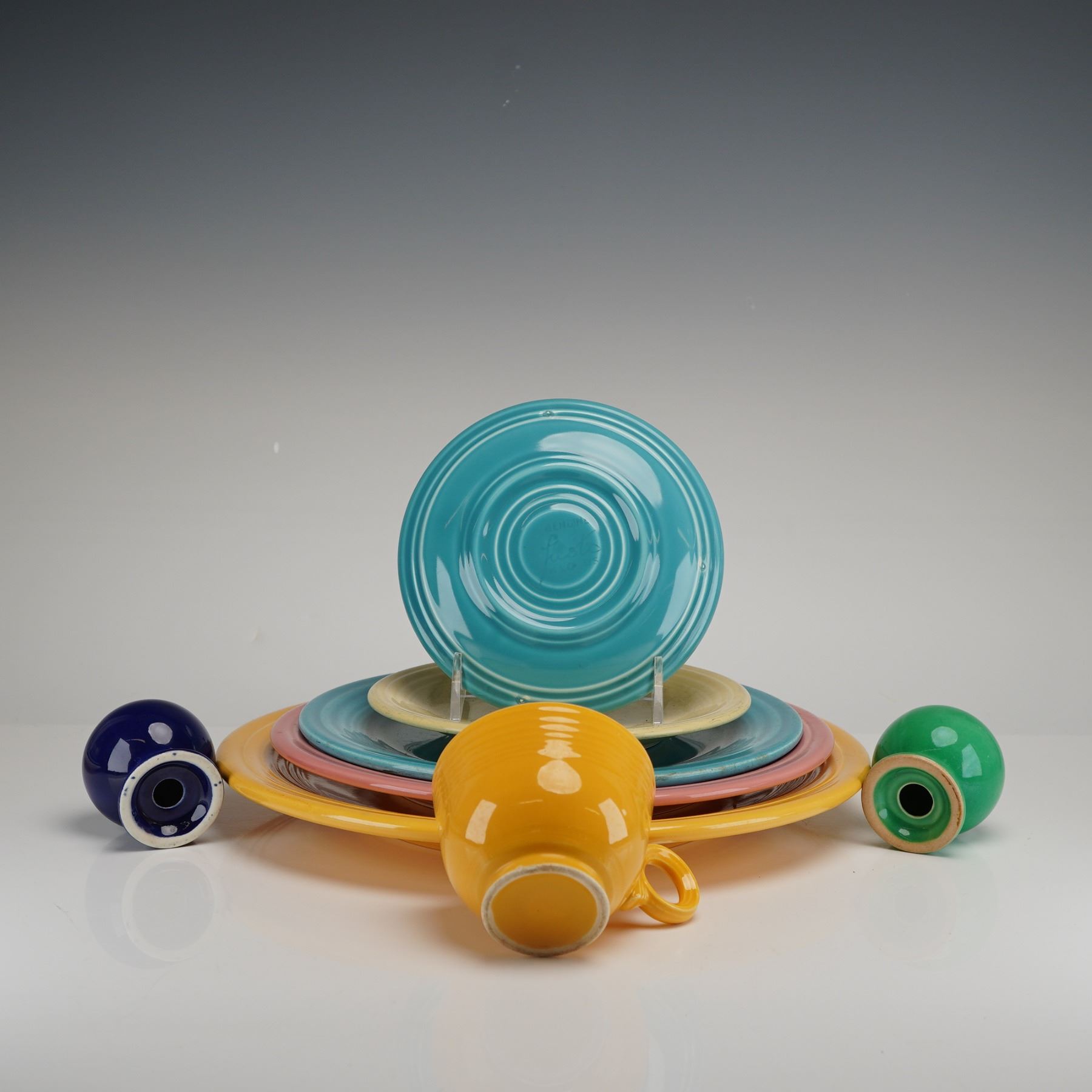 This collection consists of 8pc homer laughlin company co. fiesta dinnerware featuring the iconic Art Deco-inspired concentric ring pattern. The set includes a vibrant assortment of colors including Yellow, Rose, Turquoise, Ivory, Cobalt Blue, and Shamrock. The lot is comprised of 2 dinner plates, luncheon plate, salad plate, cup, saucer, and salt and pepper shakers. These pieces are manufactured by the Homer Laughlin China Co. and feature the genuine lead-free backstamp identifying them as post-1986 production. Measurement is for largest item: 10.5 inches.