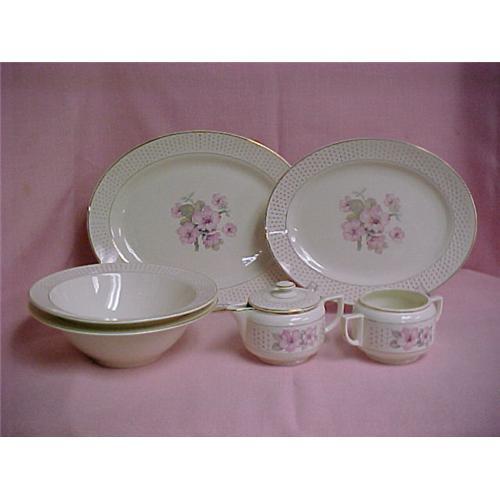 Individually priced pieces as follows: 2 - 9" vegetable bowls @ $30.00 each, 11.75" oval platter @ $35.00, 13.5" oval platter @ $45.00, covered sugar @ $18.00, and creamer @ $15.00. While there are no nicks or chips in any of these pieces, there is wearing noticeable on the gold rims.
