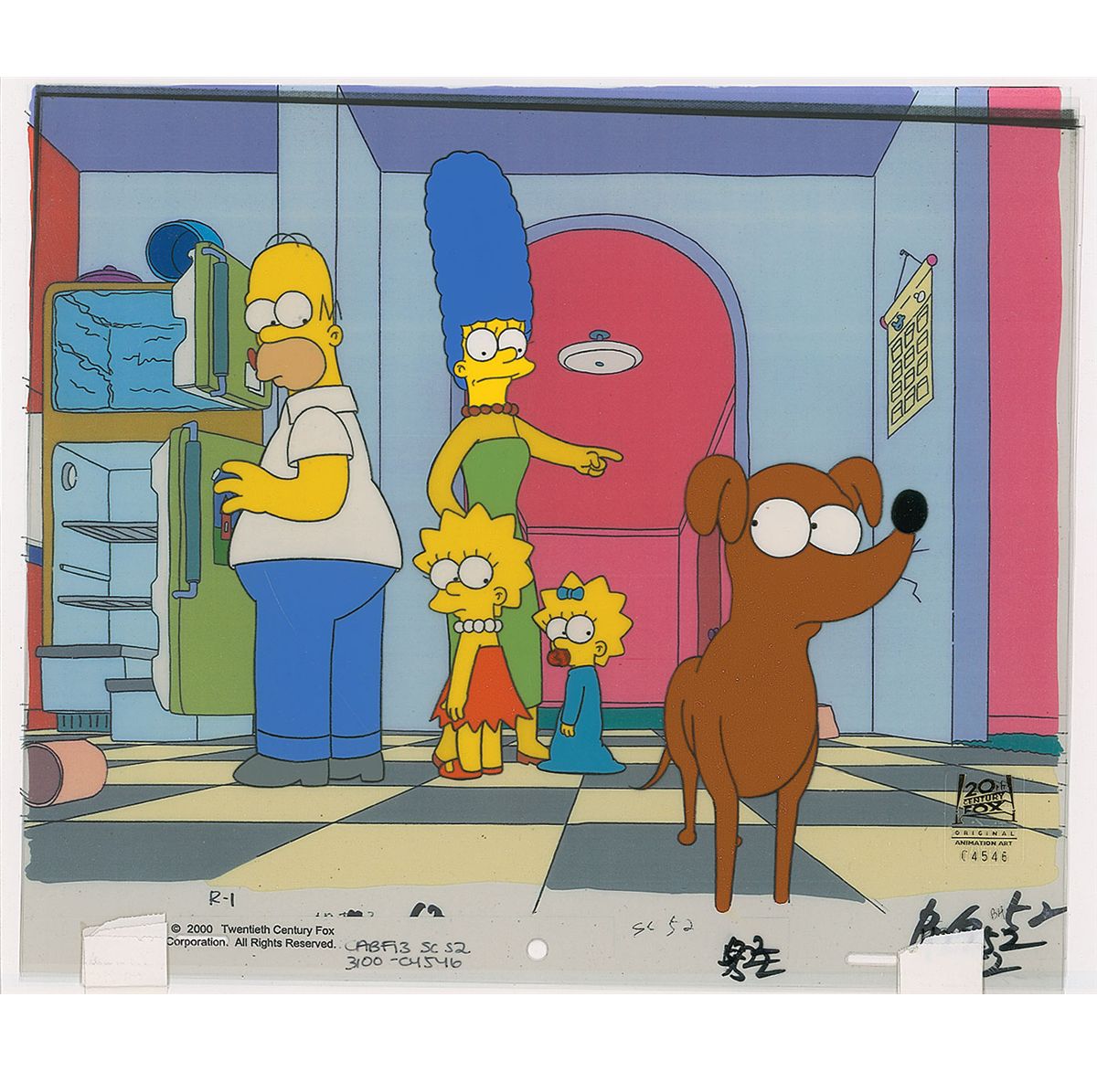 (20th Century Fox, 2001) Original production cel featuring Homer, Marge, and Lisa Simpson with Santa’s Little Helper from The Simpsons episode ‘Simpsons Safari.’ The cel is placed on a matching studio copy background. Image measures 8.5 x 9, with overall dimensions of 13 x 11. The piece has the 20th Century Fox seal on lower right and also includes a Fox COA. In fine condition.
