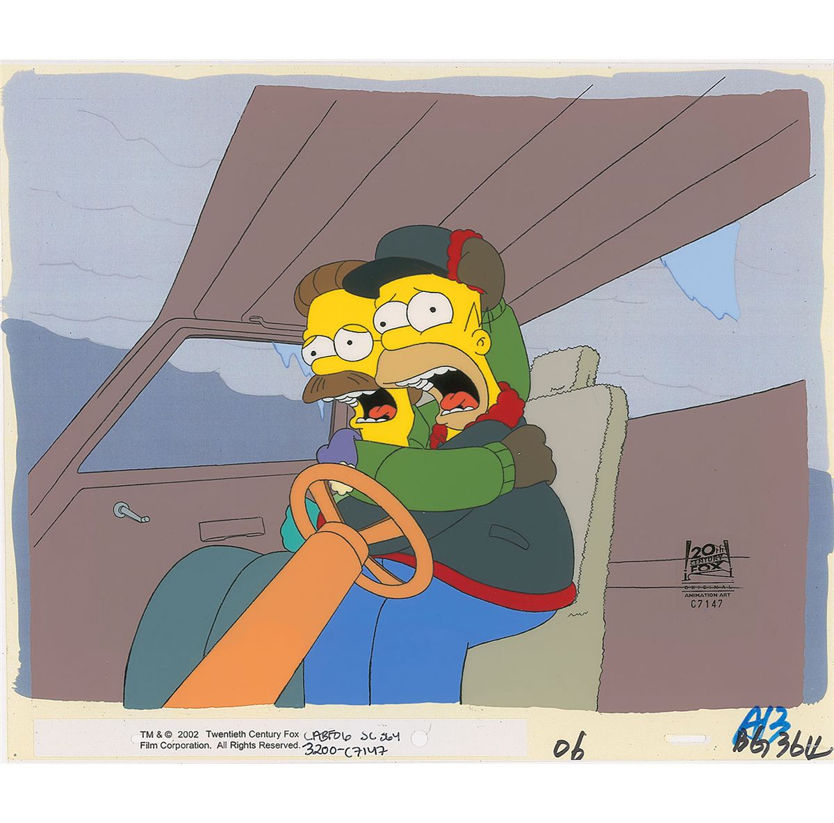 (20th Century Fox, 2000) Original production cel featuring Homer Simpson and Mr. Flanders from The Simpsons episode ‘Skinner’s Sense of Snow,’ showing Homer and Ned Flanders embraced in fright after their rescue mission goes awry. The cel is placed on a matching studio copy background. Image measures 11.5 x 9, with overall dimensions of 12.5 x 10.5. 20th Century Fox seal on lower right and also includes a Fox COA. In fine condition.