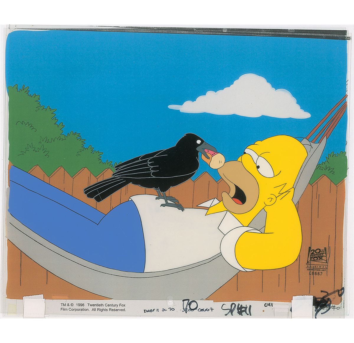 (20th Century Fox, 2002) Original production cel featuring Homer Simpson from The Simpsons episode ‘Weekend at Burnsie’s,’ showing him relaxing on a hammock with a crow perched on his belly. The cel is placed on a hand-painted background. Image measures 10.5 x 5, with overall dimensions of 13 x 10.75. 20th Century Fox seal on lower right and also includes a Fox COA. In fine condition.