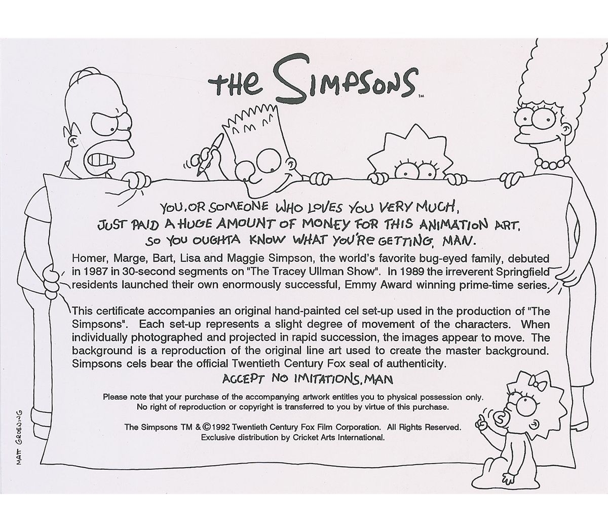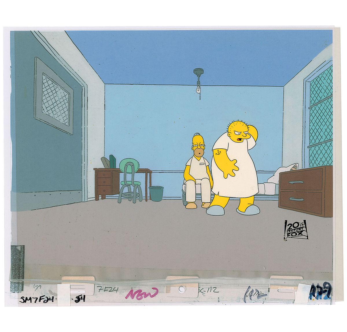 (20th Century Fox, 1991) Original production cel featuring Homer and Leon Kompowsky from The Simpsons episode ‘Stark Raving Dad,’ showing an exhausted Homer locked up with Kompowsky, who is a Michael Jackson impostor. The cel is placed on a matching studio copy background. Image measures 3 x 3.75, with overall dimensions of 13 x 10.75. The piece has the 20th Century Fox seal on lower right and also includes a Fox COA. In fine condition. Michael Jackson did the voice acting for Kompowsky in this episode, but was credited as John Jay Smith for contractual reasons.