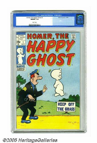 <B>Homer, the Happy Ghost #1 (Marvel, 1969) CGC NM/MT 9.8 White pages.</B></I> No, you didn't accidentally flip to the Harvey section of the catalog! This ghost isn't just friendly, he's <I>happy</B></I>, and so were his readers, because he was portrayed by a top writer (Stan Lee) and a top artist (Dan DeCarlo). This Silver Age issue reprints that duo's stories from the Atlas Comics years. Overstreet 2005 NM- 9.2 value = $150. CGC census 6/05: 1 in 9.8, none higher.