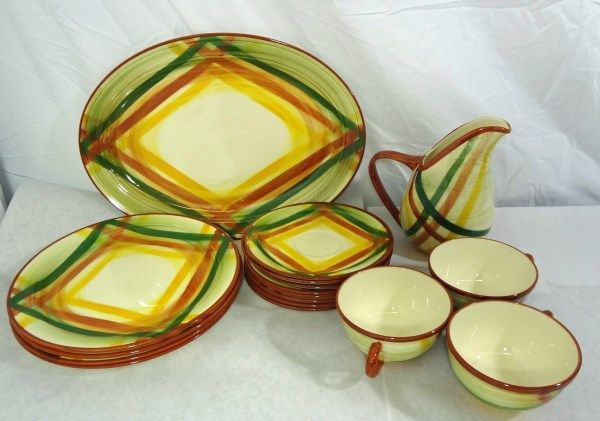 Contains 1 serving plate, 4 dinner plates, 8 saucer/ cake plates, 3 cups, and 1 pitcher. Green, yellow, and brown design. Markings say " Under Glaze, Hand Painted, Homespun, Vernonware, California USA." Looks new! Est Value $150-250.00