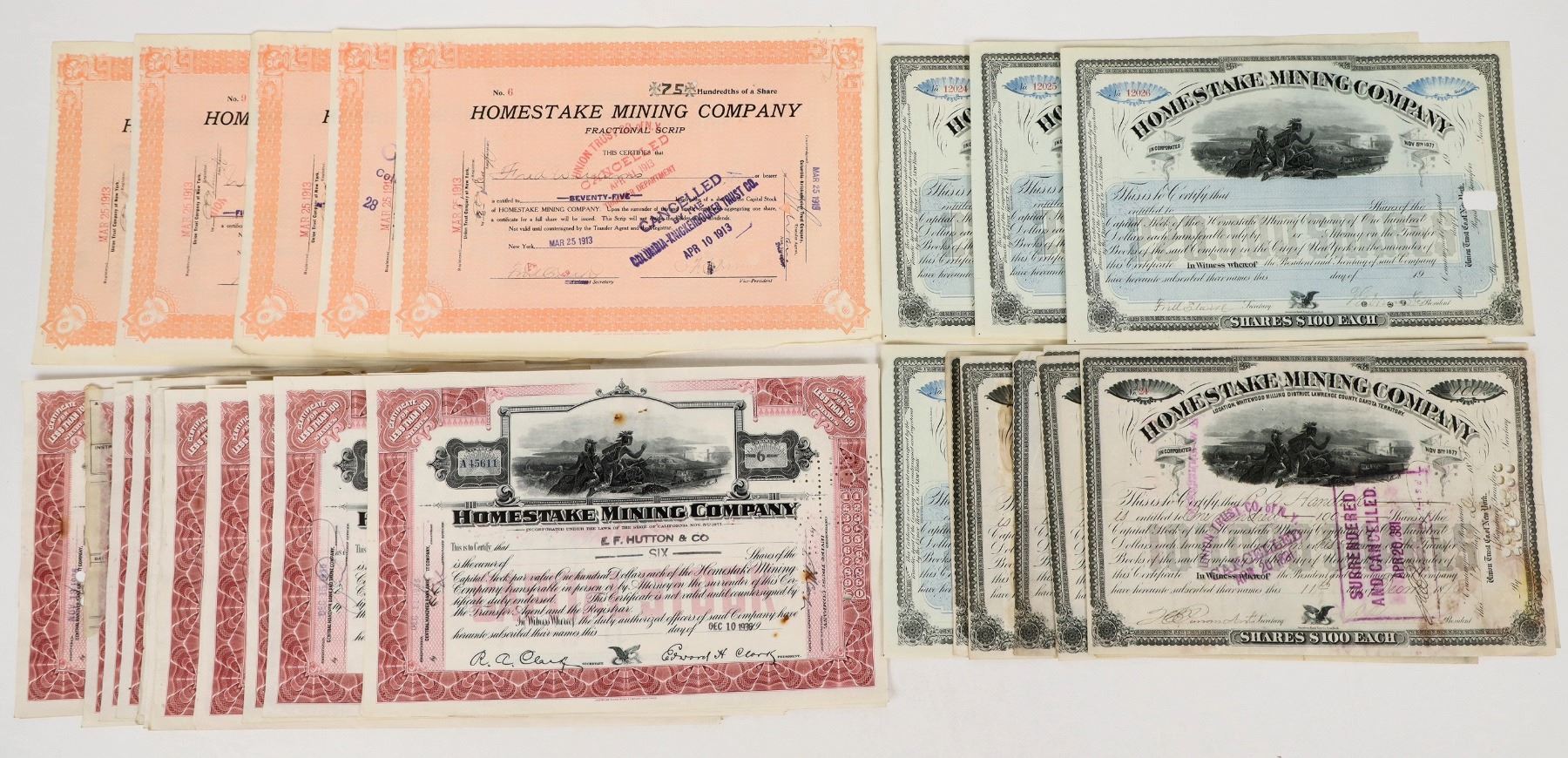 Group of 32 pieces, most issued, 4 varieties. Includes group of 7 issued in the 1870s, signed by vice president Lounsbery. Also early numbered Scrip certificates. A nice group for this important Lead, South Dakota mine operated by George Hearst and partners JB Haggin and Lloyd Tevis.