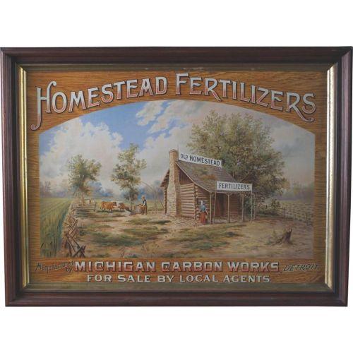 Homestead Fertilizers Tin Litho. Sign c. 1900, 30 x 24 by Sentenne & Green, New York. Great Image and Great Condition.