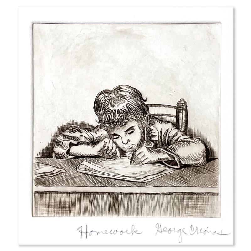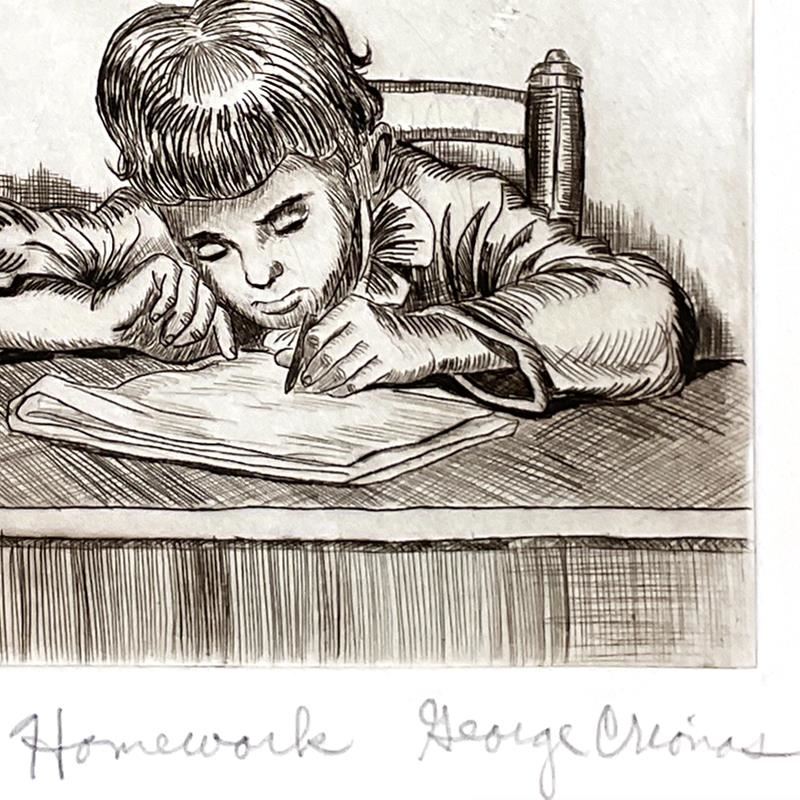 Homework by Crionas (1925-2004). "Homework" is a limited edition etching on paper by George Crionas (1925-2004), numbered and hand signed by the artist. Includes Letter of Authenticity. Measures approx. 10" x 13" (border); 5" x 5" (image).