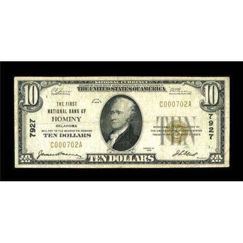 <B>Hominy, OK</B></I> - $10 1929 Ty. 1 <B>The First NB</B></I> Ch. # 7927<BR> A decent circulated example from the scarcer of Hominy's two Series 1929 issuers. A Very Fine-Extremely Fine small note from this bank realized $1265 in our Central States sale, leading us to believe this <B>Fine</B></I> specimen should easily reach or exceed...<BR><BR><b>Shipping:</b> Coins & Currency (<a target="_blank" href="http://www.heritageauctions.com/common/shipping.php">view shipping information</a>)