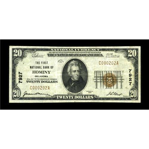 <B>Hominy, OK</B></I> - $20 1929 Ty. 1 <B>The First NB</B></I> Ch. # 7927<BR>An attractive note which is as high a grade Series 1929 example as we've ever seen for sale from here. <B>Very Fine-Extremely Fine.</B></I><BR><BR><b>Shipping:</b> Coins & Currency (<a target="_blank" href="http://www.heritageauctions.com/common/shipping.php">view shipping information</a>)