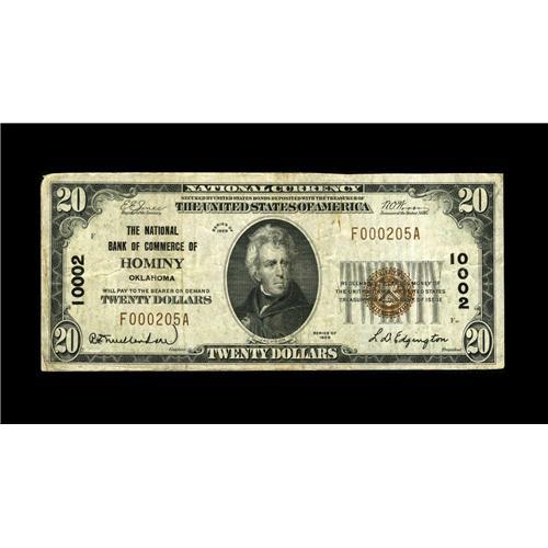 <B>Hominy, OK</B></I> - $20 1929 Ty. 1 <B>The NB of Commerce</B></I> Ch. # 10002<BR>With only one large note extant from this bank, Series 1929 examples have to suffice for today's collectors. This piece carries the highest grade of any listed in the census. <B>Fine-Very Fine.</B></I><BR><BR><b>Shipping:</b> Coin/Currency (<a target="_blank" href="http://www.heritageauctions.com/common/shipping.php">view shipping information</a>)