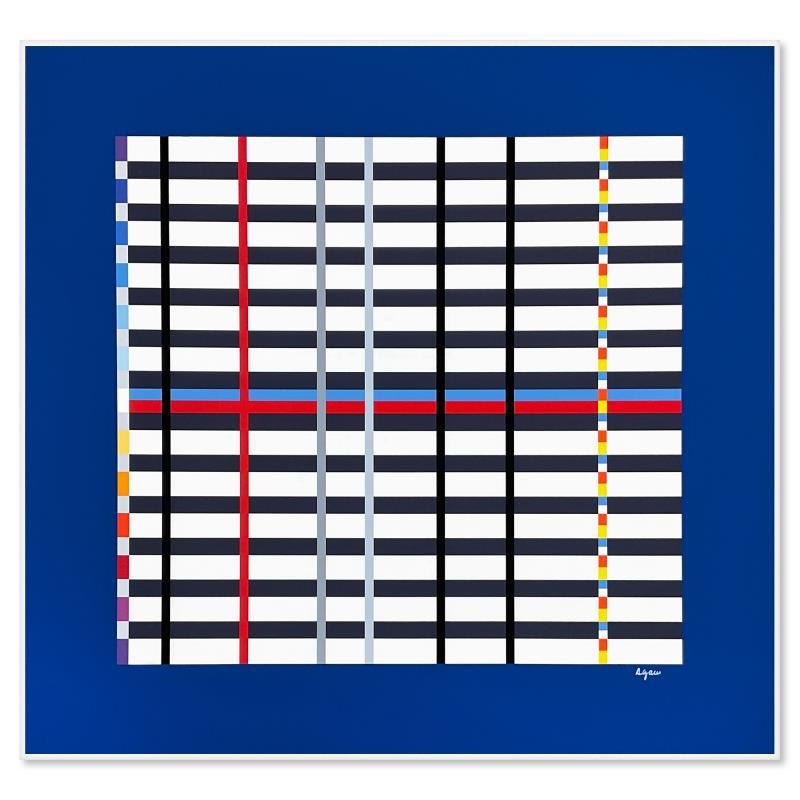 "Hommage du Mondrian (Dark Blue)" is a limited edition serigraph on paper by Yaacov Agam hand signed by the artist. Includes Letter of Authenticity. Measures approx. 26.5" x 28" (image).