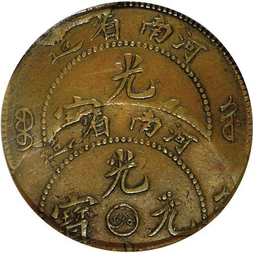 <B>Honan Mint Error 10 Cash (1905), </B></I>KM-Y108, XF45 PCGS, double-struck with the second impression 45% off center. Very entertaining error with two dragons.<BR><BR><b>Shipping:</b> Coin/Currency (<a target="_blank" href="http://www.heritageauctions.com/common/shipping.php">view shipping information</a>)