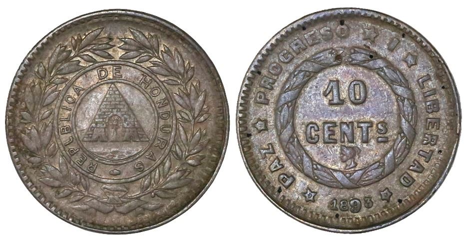 Honduras, 10 centavos, 1893/83, NGC AU details / reverse damage, ex-Carter (stated on label). KM-49. Lightly rainbow toned, with muted luster on fields, tiny punchmark in wreath. NGC #4724632-006. Pedigreed to the Amon Carter collection.