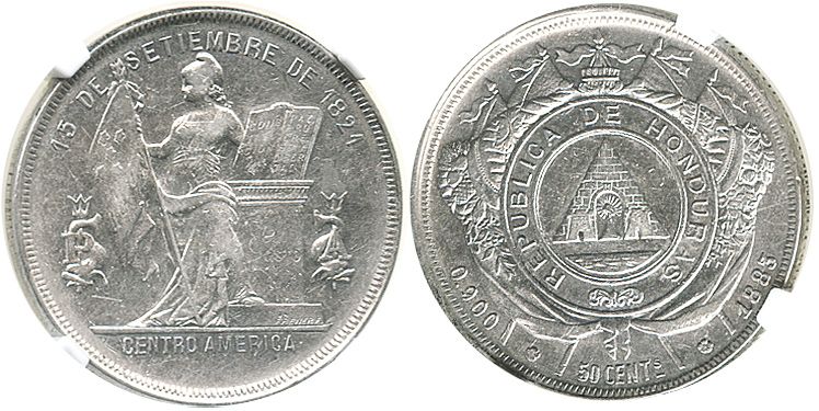 Honduras, 50 centavos, 1883, encapsulated NGC AU 50, finest (and only) known graded by NGC.