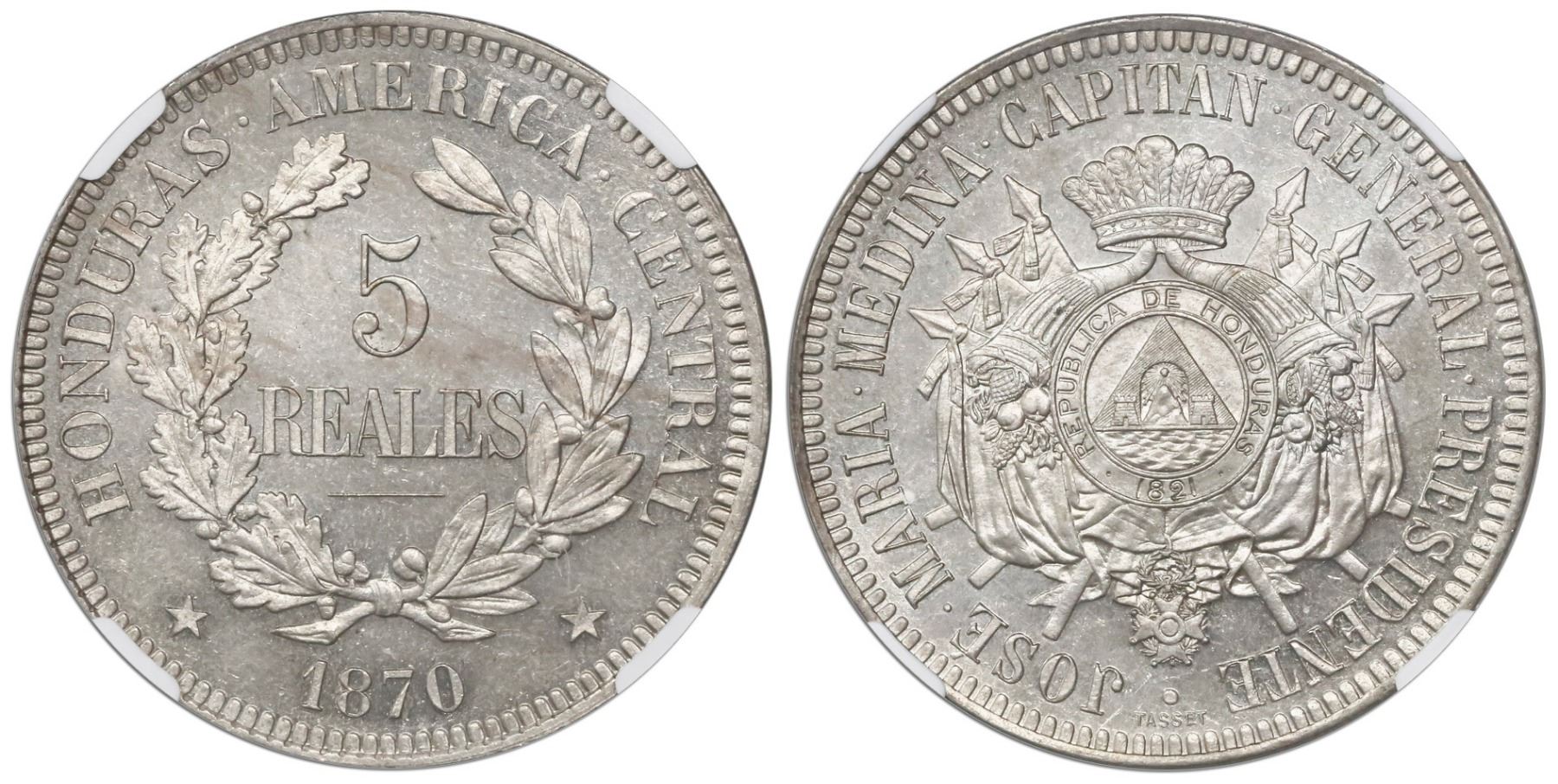 Honduras (struck in Paris), proof copper-nickel pattern 5 reales, 1870 (TASSET), rare, encapsulated PF 64, ex-Richard Stuart (as stated inside slab). KM-Pn12. Nice luster, small streak of light toning across reverse, second finest known in NGC census. NGC #4427714-001. Pedigreed to the Richard Stuart collection.