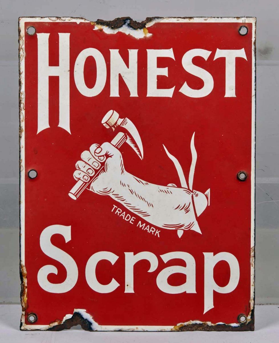 This sign features an arm with hammer. It is red and white with damage to edges. Condition (Very Good). Size 9" x 12'