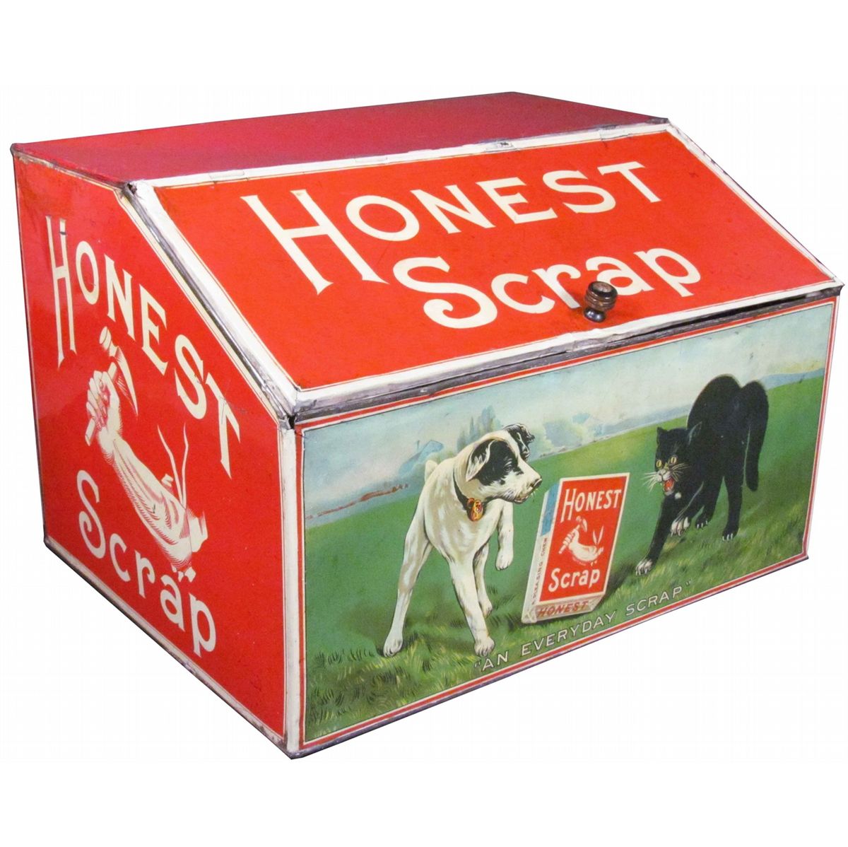 Honest Scrap Tobacco Tin Store Bin. Some minor touch up otherwise very good condition. 18 X 12 X 14 inches.