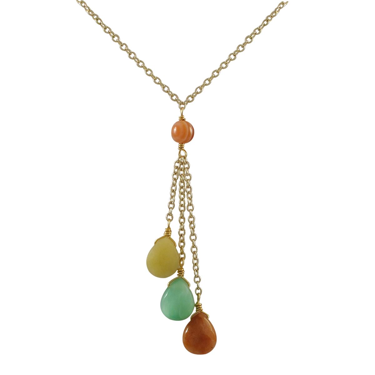Honey And Green Chalcedony Combination Semi Precious Teardrop Stone Lariat Style Necklace, Gold Tone Brass Chain- 16" 2"