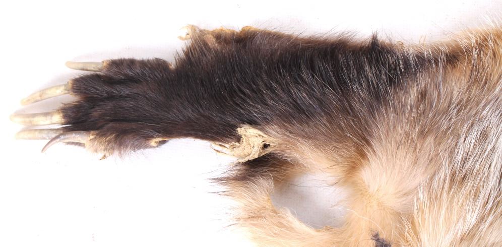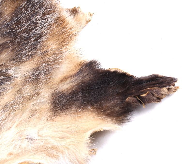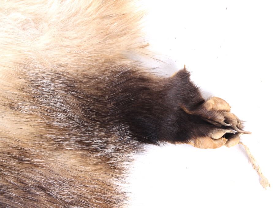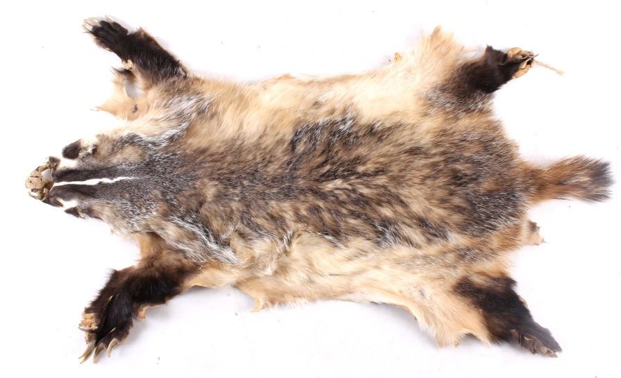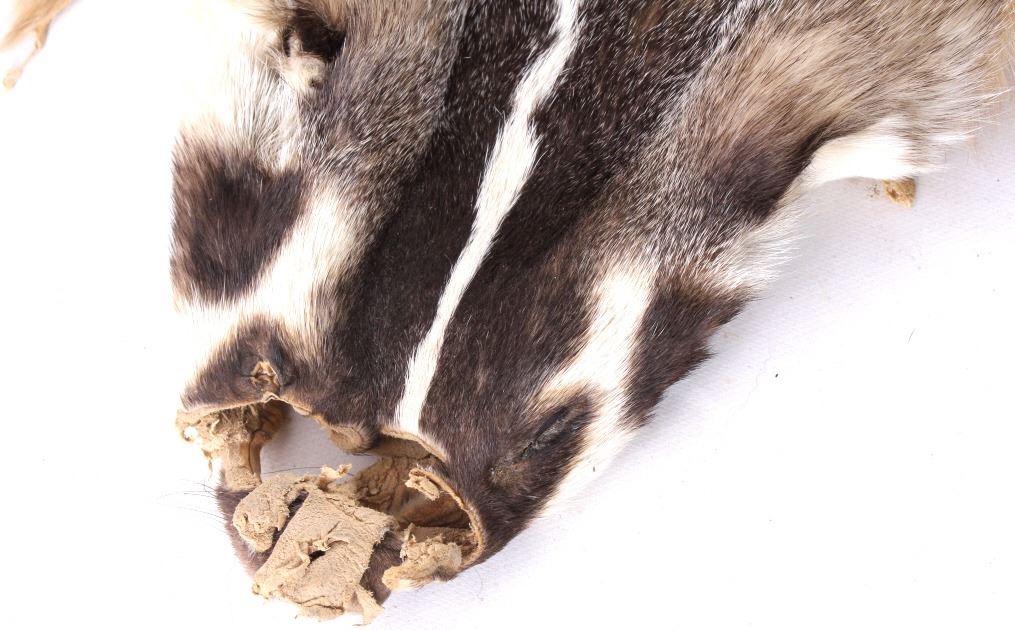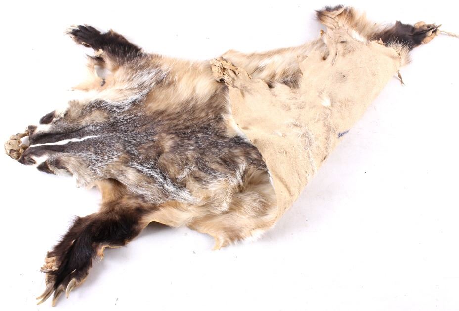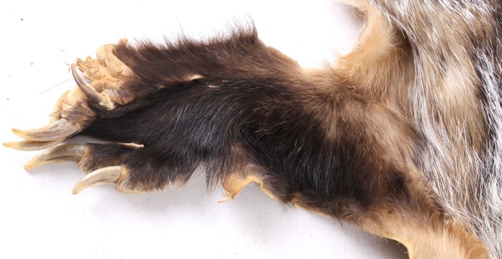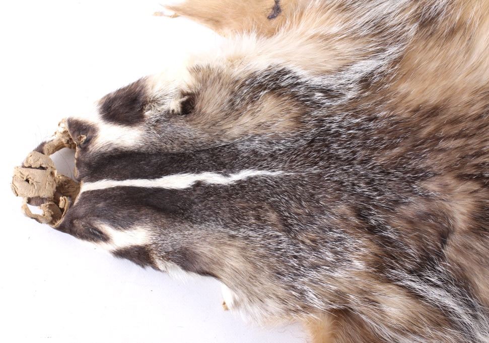 In this lot we have a Honey Badger hide. On the face of the badger hide there is a white line the runs up the center of the head end at the top of the head. Around the white line on the head there is brown that surrounds it There is dark fur that runs down the middle of the back all the way to the tail with it the fur getting lighter as you go down the sides of the hide. The claws are still on the badgers hide along with it's snout. This hide measures 33" x 18."