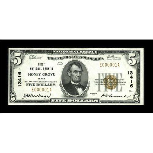 <B>Honey Grove, TX</B></I> - $5 1929 Ty. 1 <B>First NB</B></I> Ch. # 13416<BR>A beautiful serial number 1 note from one of the more imaginatively named Texas communities. This example is crackling fresh and appears as nice as the day it was printed. There is one old sheet fold in the top margin, but only it would be a travesty to call this utterly original beauty anything less than <B>Choice Crisp Uncirculated.</B></I><BR><BR><b>Shipping:</b> Coin/Currency (<a target="_blank" href="http://www.heritageauctions.com/common/shipping.php">view shipping information</a>)
