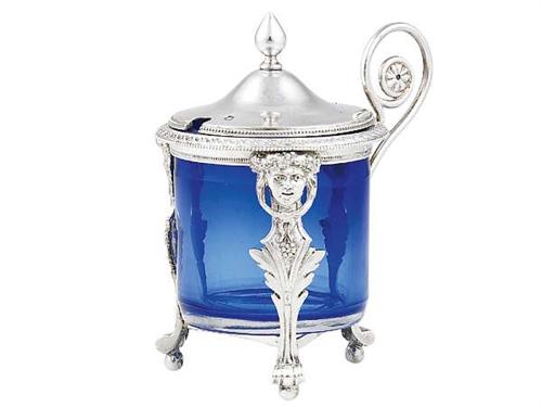 Silver, 104 g. Raised on three stylised supports, under the upper rolled rim there are bacchantes, scroll handle. Hinged cover with beaded decoration and plastic final. The glass lining is missing. Marked: Paris, between 1809 and 1819 Rosenberg IV