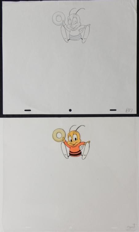 It's a honey of an O! * * * Original Animation Cel & DrawingMedium: Hand painted acetate celDetails: Animation notations and peg holes * * Original "rough" animation drawing, in non-photo blue and black pencil * * Size of cel: 10 1/2 x 12 1/2 inchesSize of drawing: 10 1/2 x 12 1/2 inches * * Condition: Very good * This is an original hand-painted cel set-up used in the production of * the "Cheerios commercial." Each one-of-a-kind set-up represents a slight * change in position of the characters. When individually photographed * and projected in rapid succession, the images * appear to move. To created production cels, the original animator's * drawing is transferred onto an acetate cel (by hand-inking and/or photo * copying). The cel is then hand-painted on the reverse side. * * * * Traditional animation is a multi-step process which includes various * types of art techniques. Drawings are a key part of the process, in * which the animator creates the design and movement of the characters. * Drawings are then transferred onto acetate cels * (by * hand-inking and/or photo copying) to create a production cel, which is * then hand painted on the back side, using paint colors chosen and * approved by the creator of the series.