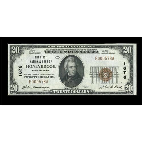 <B>Honeybrook, PA</B></I> - $20 1929 Ty. 1 <B>The First NB</B></I> Ch. # 1676<BR> A lovely Series 1929 example from this Chester County bank. <B>About Uncirculated,</B></I> with a tiny bit of glue residue on the reverse top margin.<BR><BR><b>Shipping:</b> Coins & Currency (<a target="_blank" href="http://www.heritageauctions.com/common/shipping.php">view shipping information</a>)
